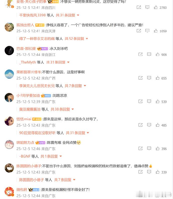 陈震多平台被禁言 本来以为是封几天的事,结果现在陈震偷税案热搜第一,偷税追缴并罚共计247.48万元,旗下公司曾欠税2965元!还是央视新闻发的,看来事情没那么简单了,而且评论区基本清一色的建议永久封杀…经查,2021年至2023年,陈震通过隐匿收入、转换收入性质、进行虚假申报等方式,少缴个人所得税共计118.67万元。陈震偷税案陈震偷税追缴并罚共计247.48万元陈震名下公司因欠税被公告