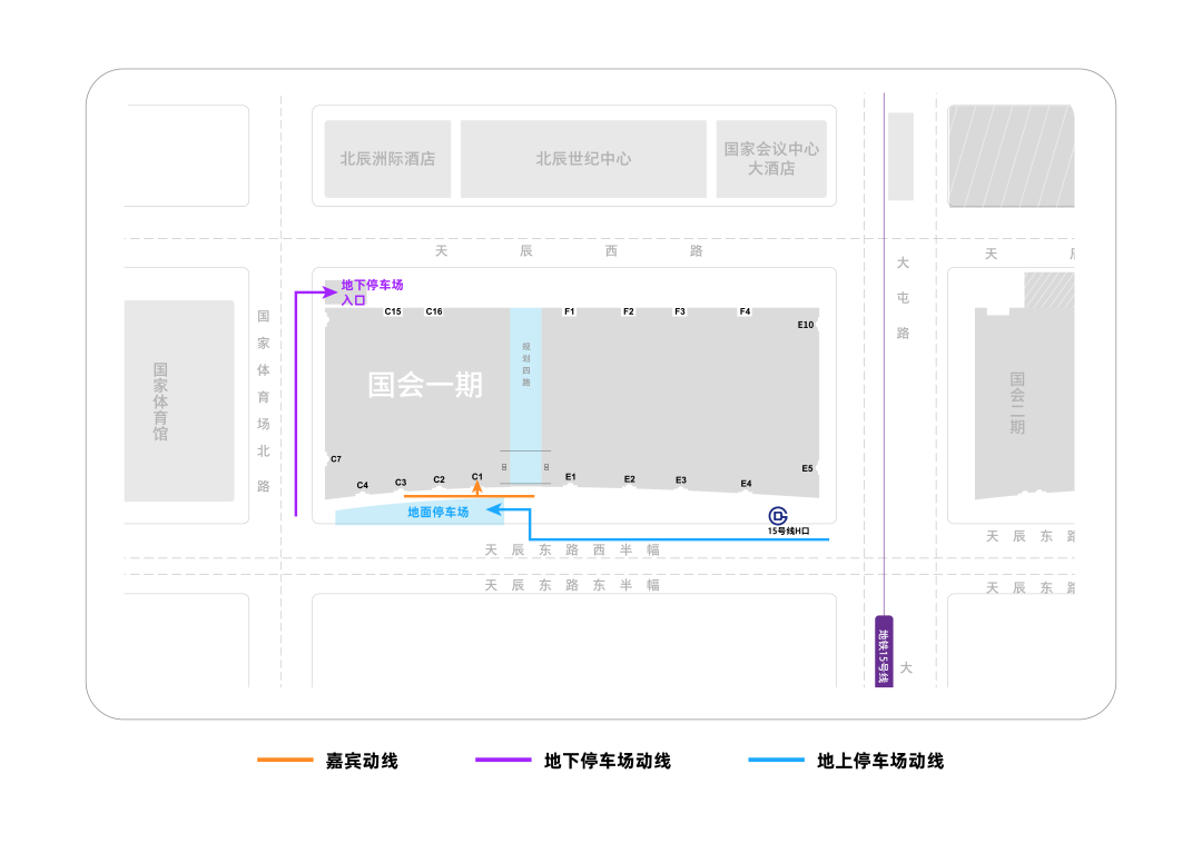 自驾前往:地下停车场入口位于国家会议中心一期西侧,C15门附近。