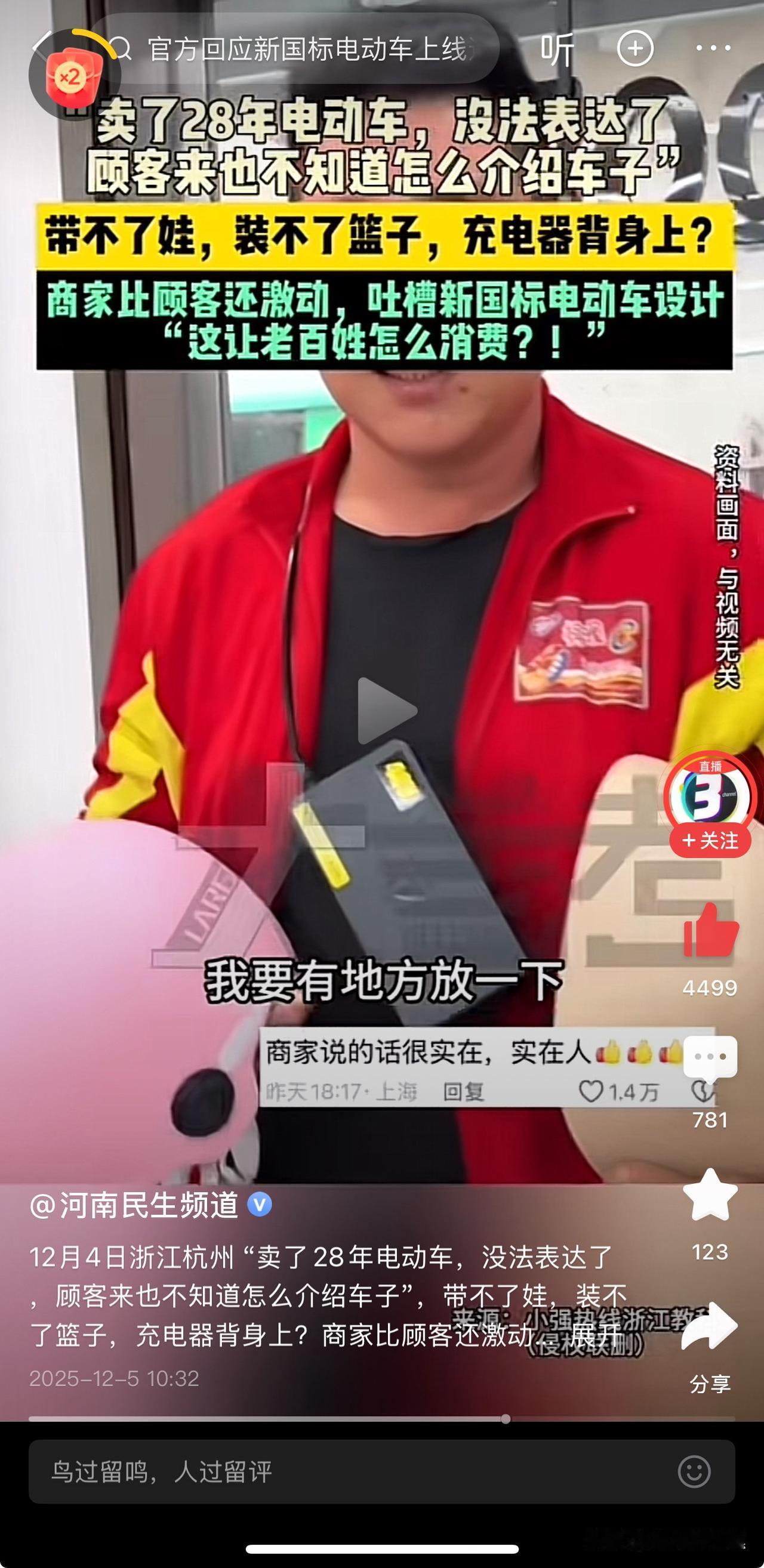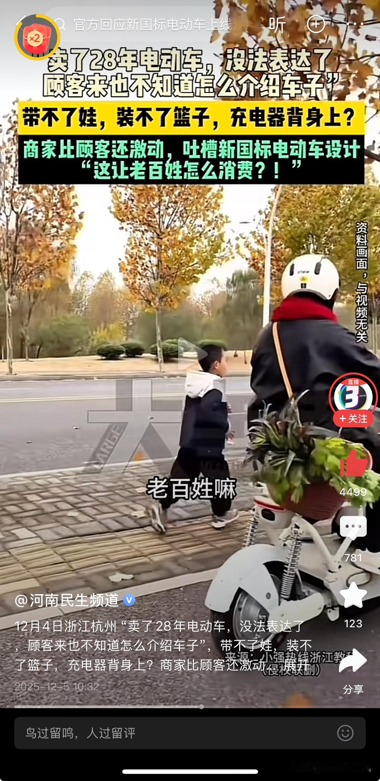 “为人民服务”就是要“全心全意” 新一代电动自行车国产出来了,结果不仅顾客傻眼,连销售人员都被干懵了。 唯一能说得过去的理由:限速25公里/小时,好,可以接受。本来大多数人购买电动自行车并不是为了飙车,而是一个省力的代步工具。 可是你把车座做成活动的是几个意思?方便小偷吗?毕竟给车座子安个GPS不太值当得吧。 接着又把储物盒子给取消了,这又是为什么?老百姓骑个电动车去买个菜,你都不允许? 还有一个更严肃的问题,你现在严禁不许将车推进家中充电,请问,充电器、头盔、车座放哪儿? 我想问问,这个主意是谁出的!他出这个主意的时候,想起那五个字了吗?