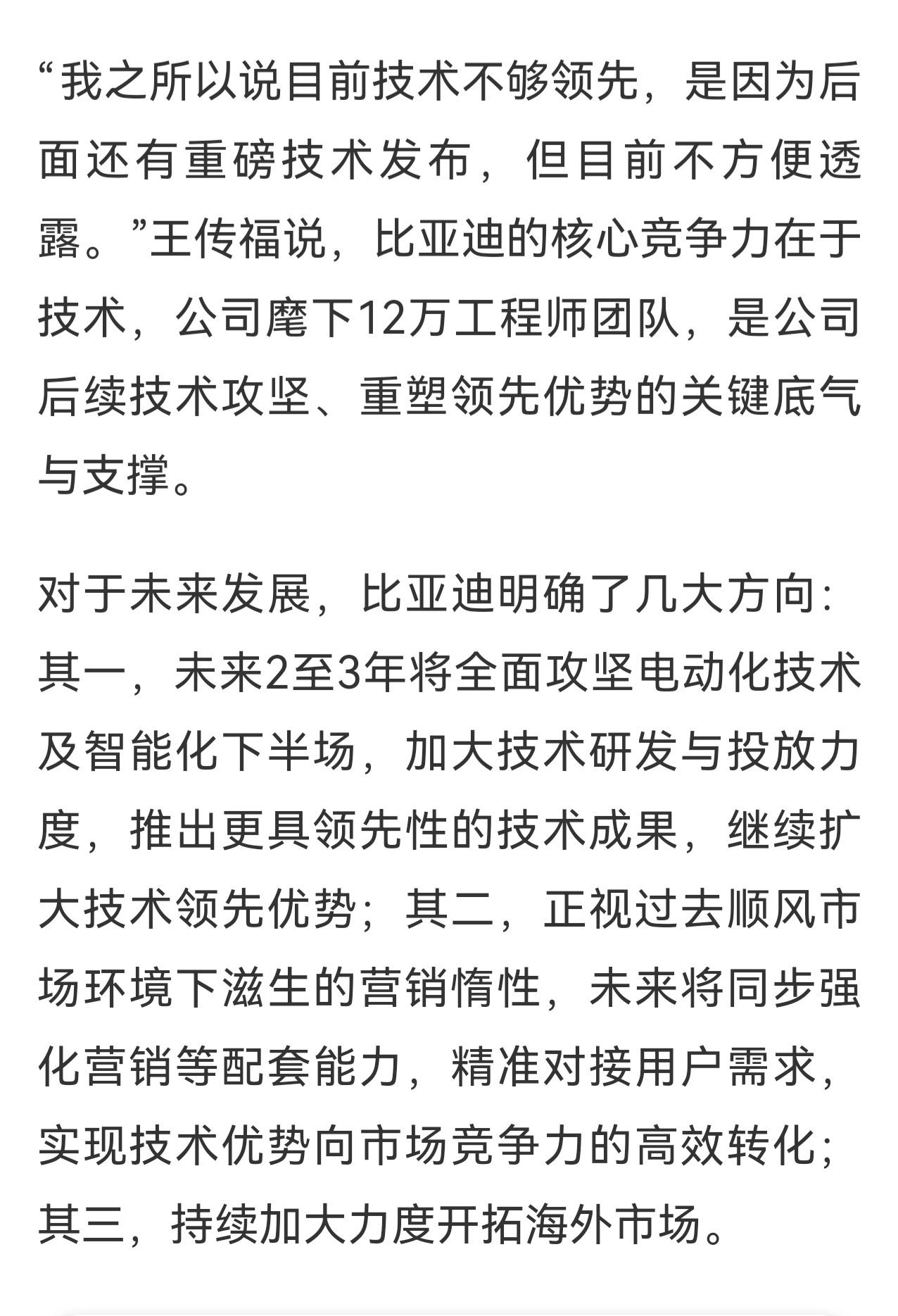 比亚迪老王终于认错了。 “今年销量下滑主要是因为技术领先度不及前几年,但是,大家不要慌,我们后面还有重磅技术要发布,只是现在不方便说。” 今年比亚迪搞得技术发布会,一点水花都没有。跟大疆合作的车载无人机专门发布一次,跟地平线合作的全民智驾专门发布一次,兆瓦闪充又专门发布一次,其实都有点技术鱼池快干了的感觉。 老王显然也是有些不好意思了,毕竟一年几百亿投进去,这点成果实在有点寒碜。 前几年很骄傲的易四方,易三方技术也不被市场接受,完全没有匹配上用户需求,腾势,仰望两大品牌也是走的跌跌撞撞,连滚带爬。 不过,老王毕竟是大神,既然说了后面还有重磅技术,那就值得期待,明年一季度技术发布会再看吧,希望能够让人眼前一亮。