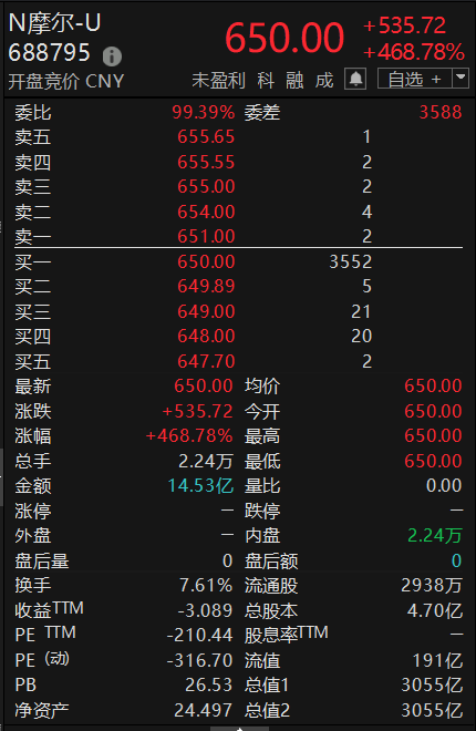 摩尔线程上市首日高开468.78%,报650元/股。截至收盘,盘中价格最高报688元/股。按开盘价计算,中一签赚超26.7万元。