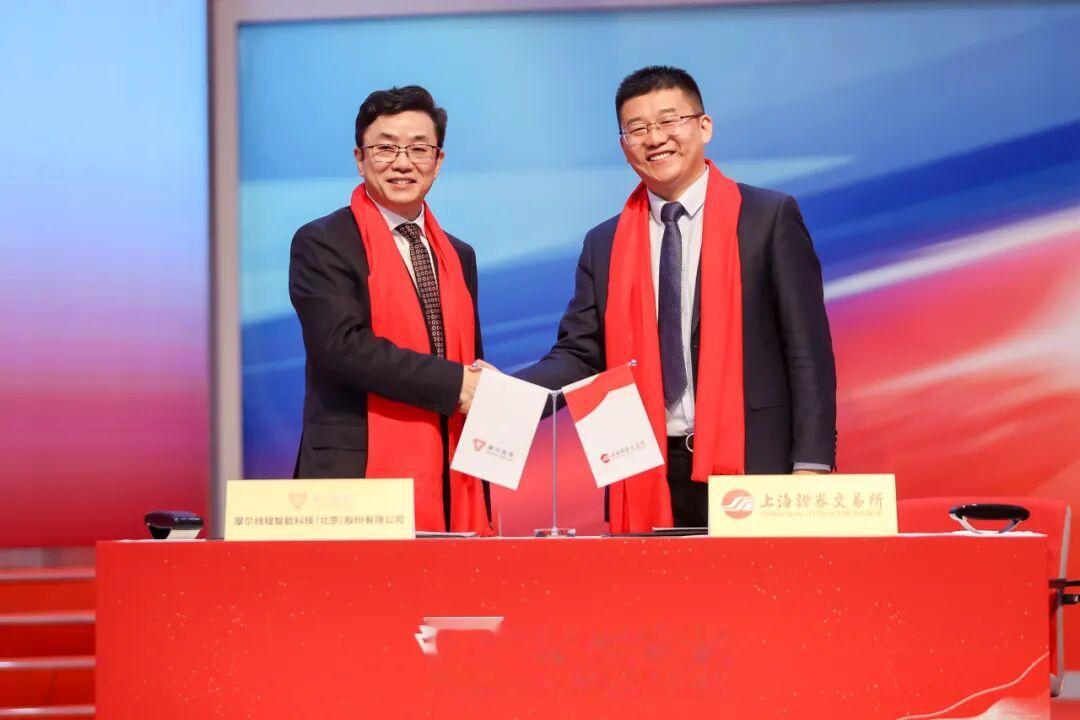 上市仪式上,上海证券交易所副总经理吕昊,摩尔线程创始人、董事长兼总经理张建中签订了公司科创板证券上市协议,并代表双方互赠纪念品。