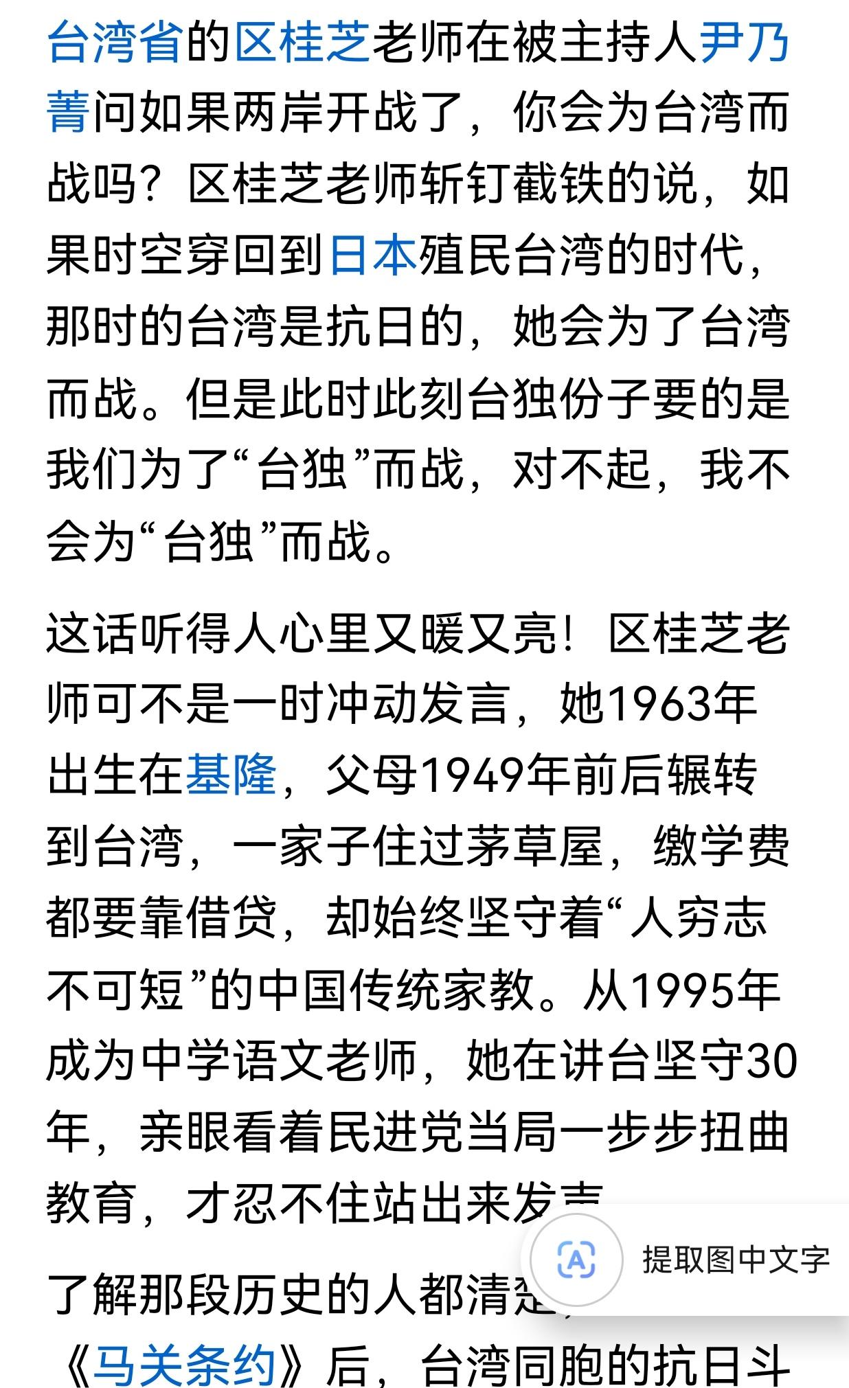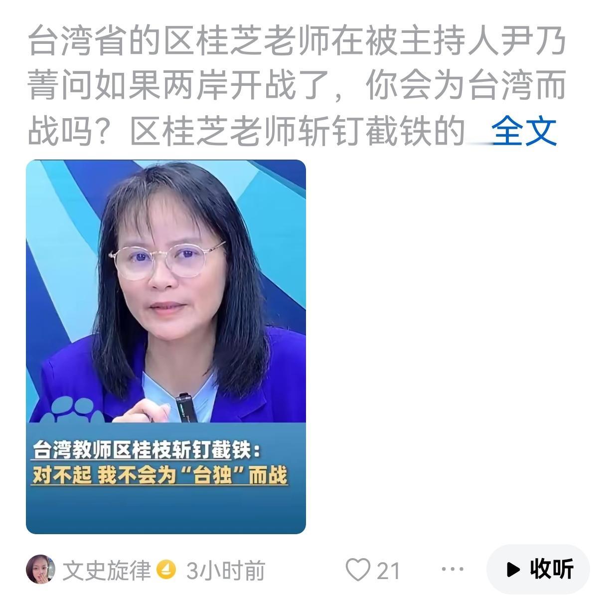 台湾地区的区桂芝老师在被主持人尹乃菁问如果两岸开战了,你会为台湾而战吗?区桂桂芝
