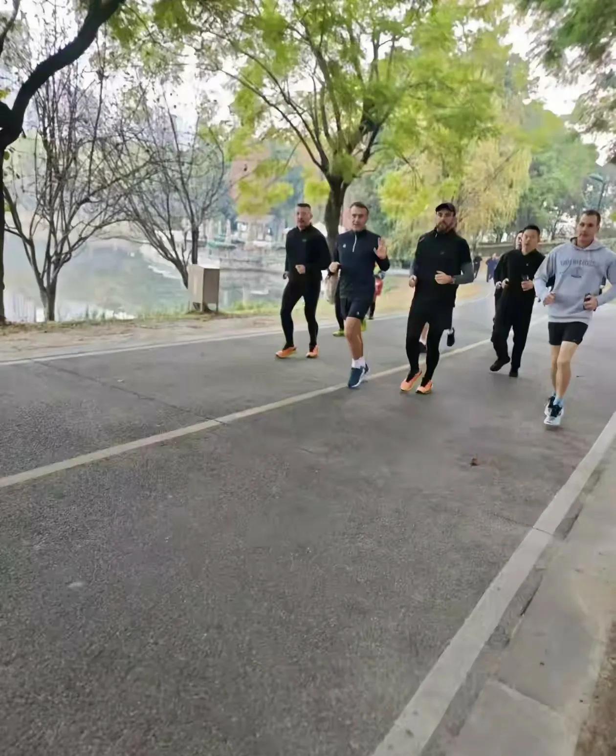 不得不说,马克龙身体素质好呀! 这么冷的天! 成都清晨只有几度呀! 挺冷的! 他穿着短裤就上阵开路了! 人很接地气,务实,着到我国民众主动打招呼!亲和力蛮强的! 很会打亲民牌![赞][呲牙]