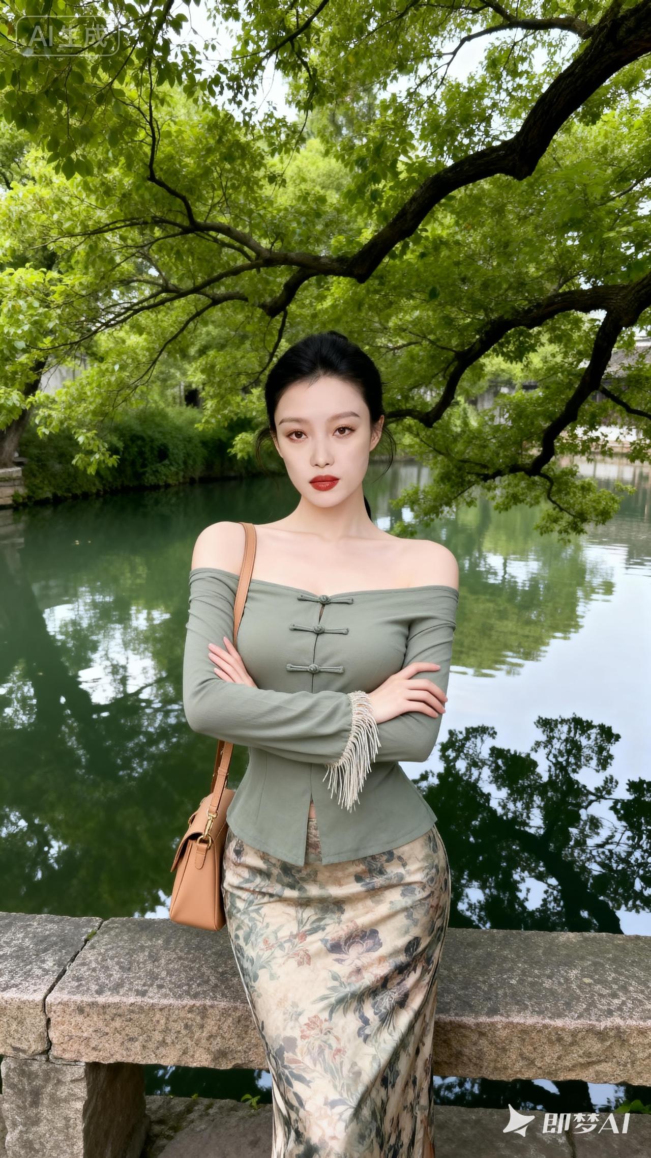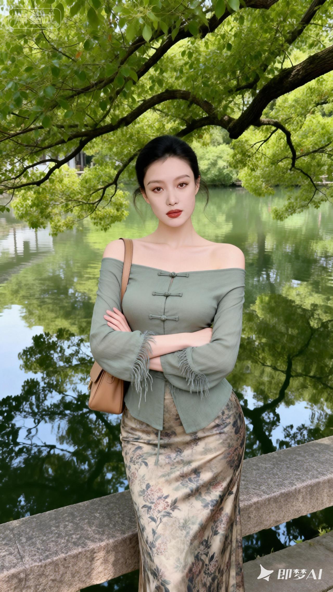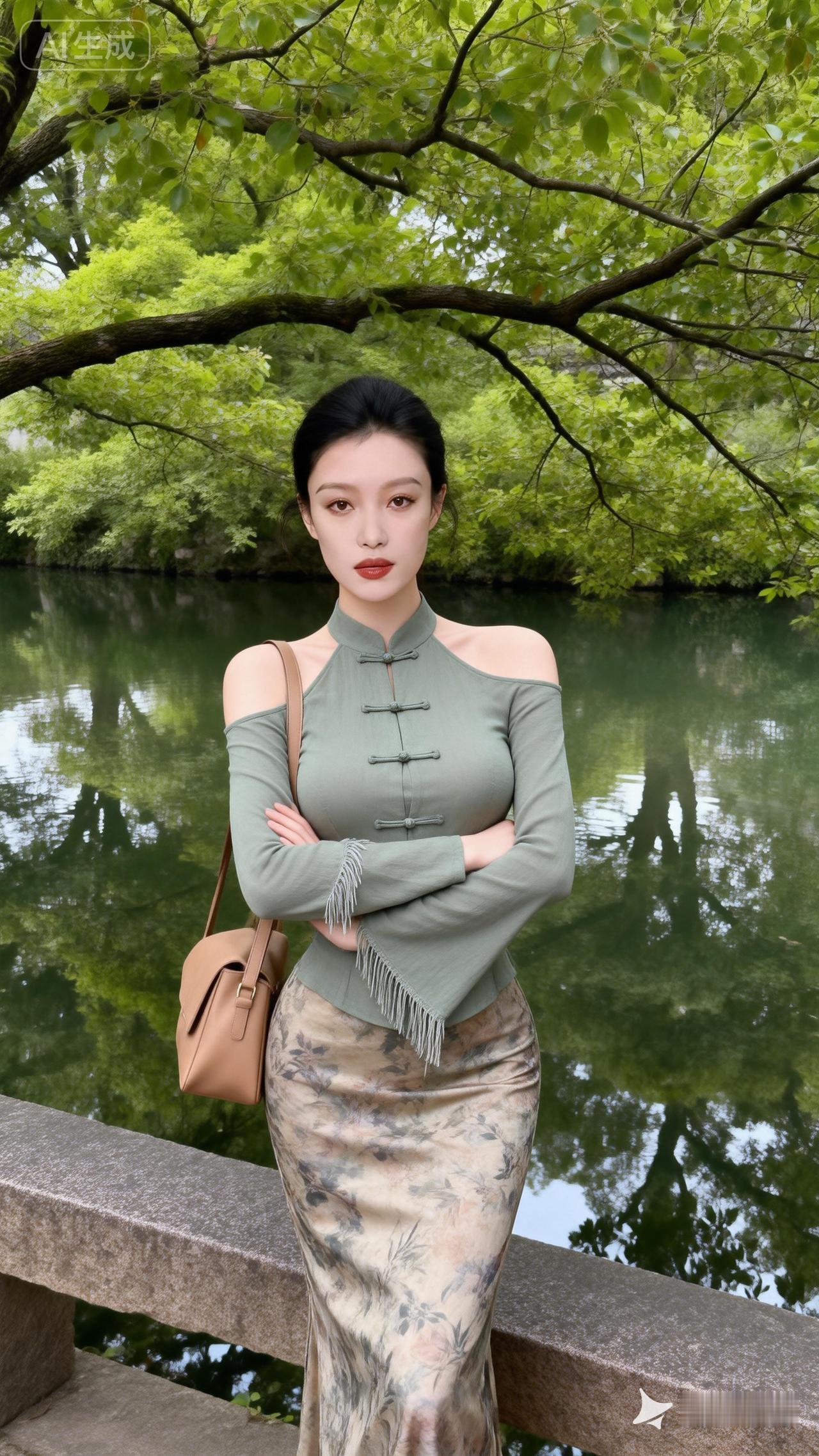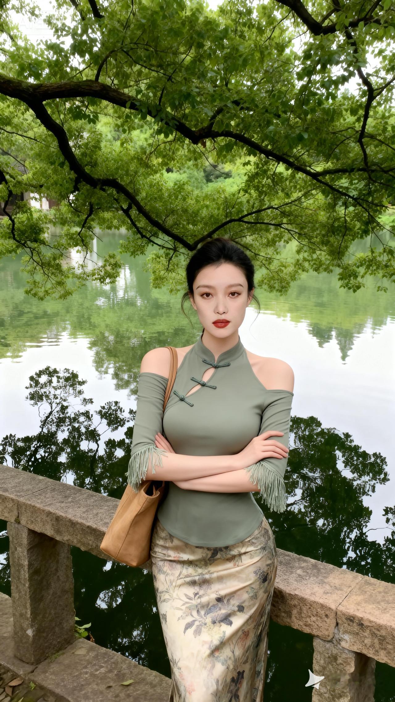 优雅的旗袍美人,撑伞漫步在绿意盎然的庭院中,宛如一幅水墨画。