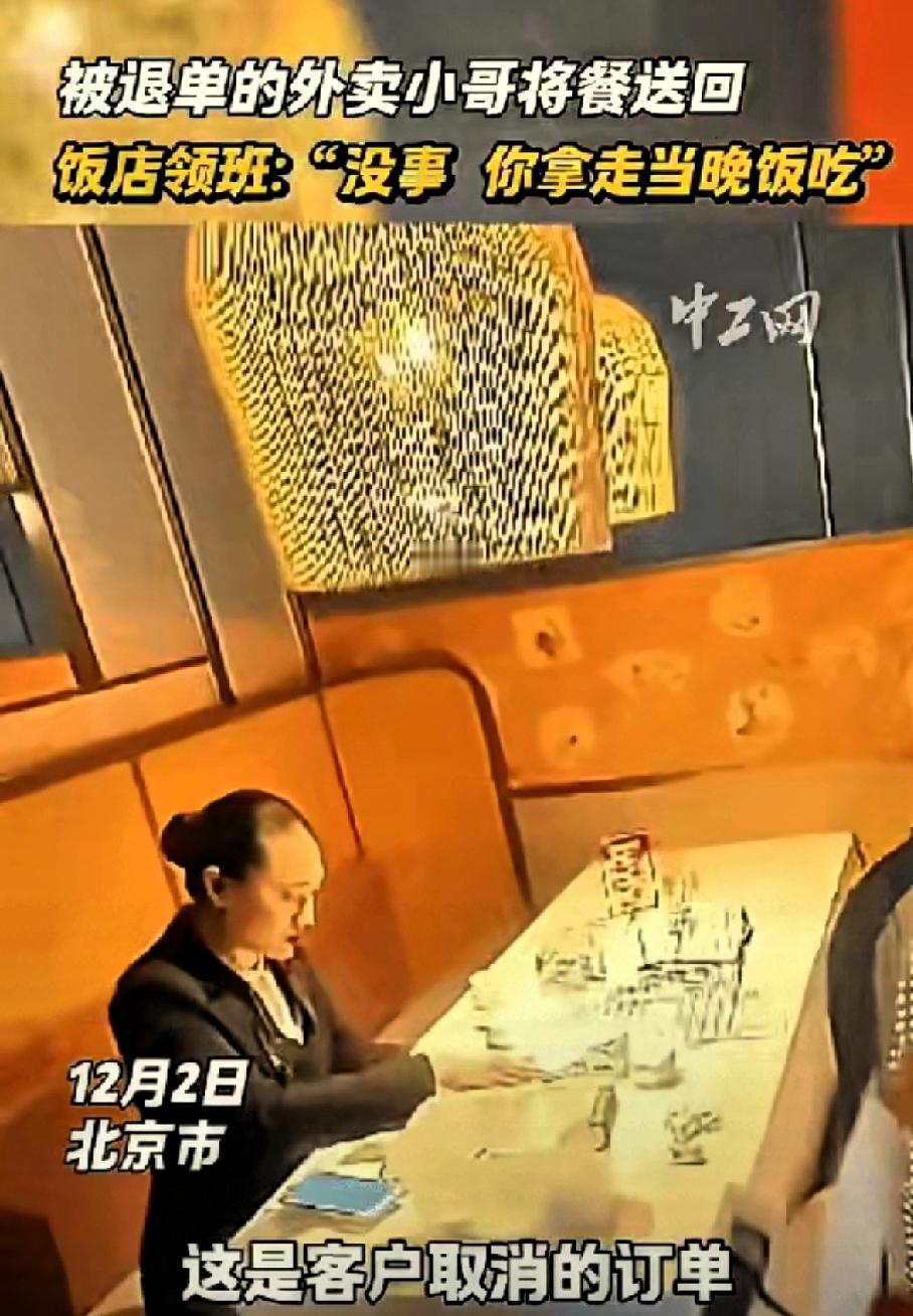 这样的商家也话该你发财! 真的“超暖心”! 12月2日,北京一外卖小哥刚把餐送到。顾客那边直接取消订单,理由是“等太久了”!因为当时正是北京晚上下班的高峰期,商家出餐时又耽误了一些时间,所以骑手送到半路就己超时了,骑手只好把外卖原路退回商家,还担心被商家埋怨,可谁知道老板直接把外卖转身递给了骑手,还安慰说“没事,你拿当晚饭吃,放在这里也没人要”! 好暖心的老板,有格局的商家,这样的商家今后的生意不会错的,二次销售不可能,扔了可惜,送给骑手也是一样!好人好商家,人间有爱有理解!善侍他人,必发大财!为老板点赞👍👍