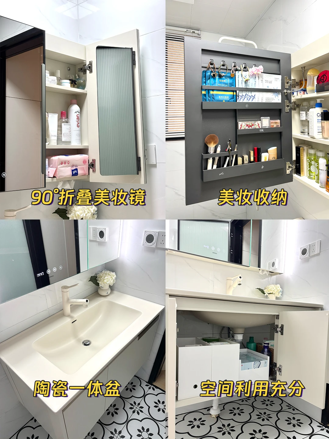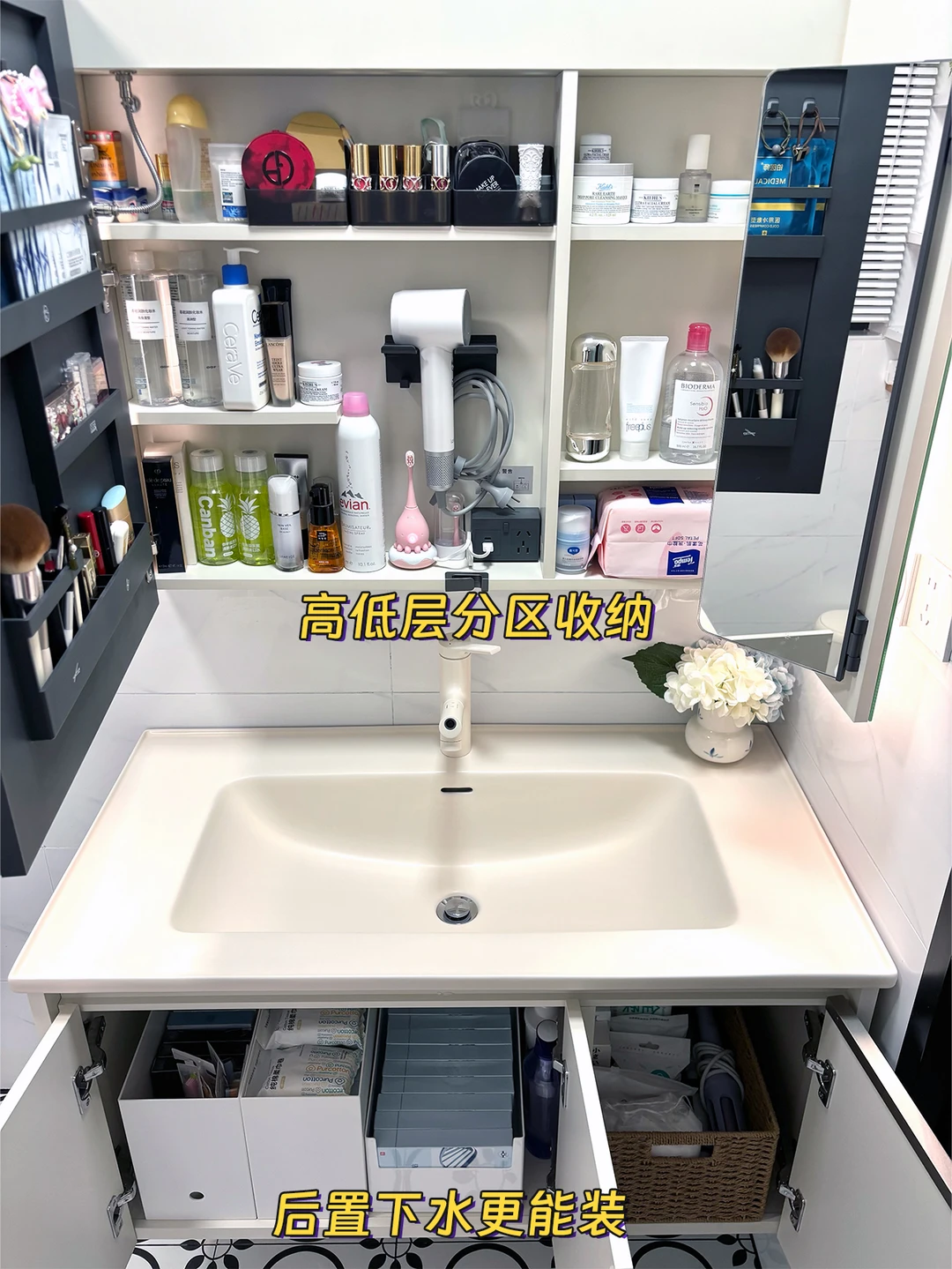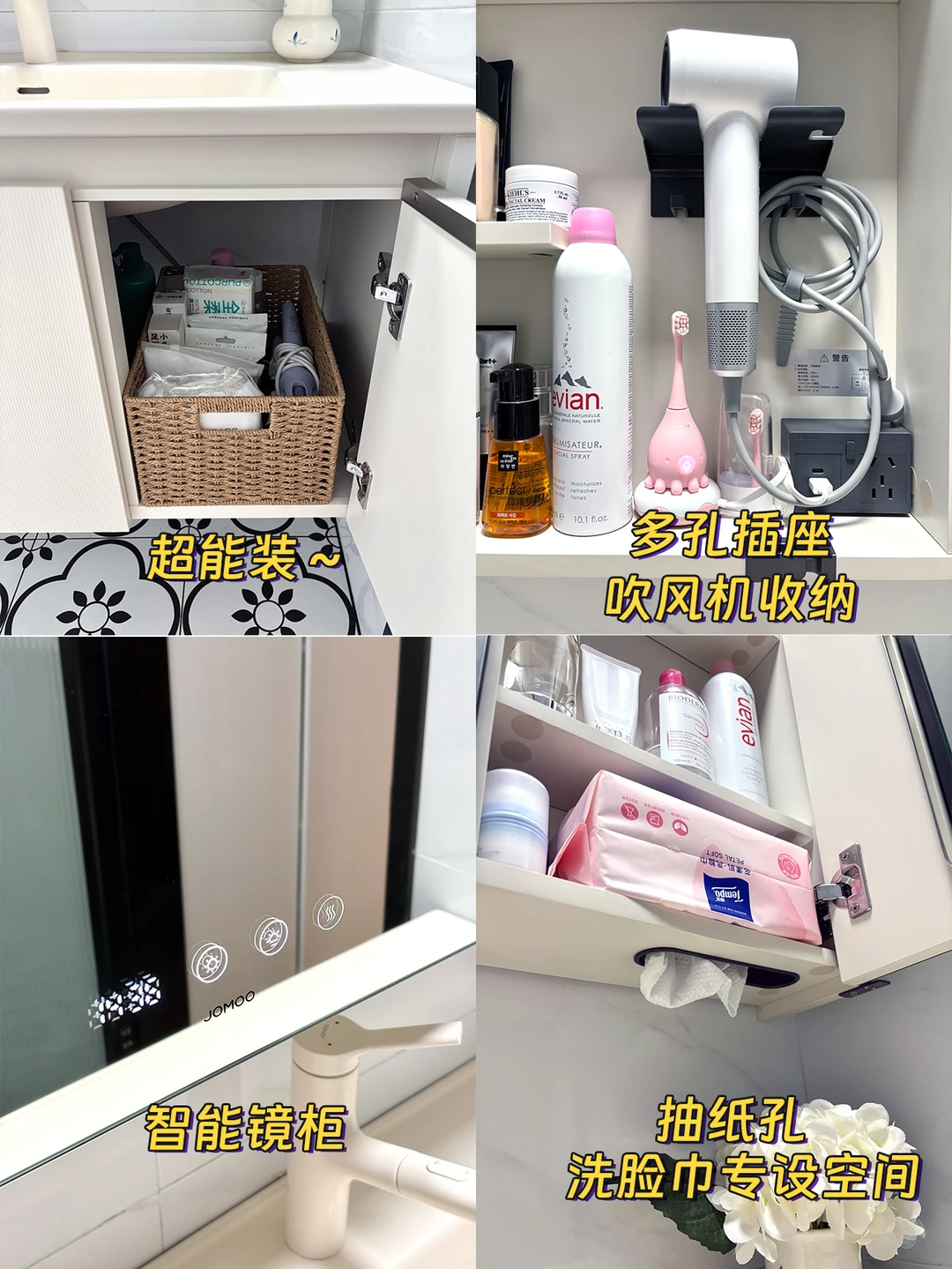另外用的也是陶瓷一体盆,16cm的加深内胆,平时洗点衣服也不会水溢出来!镜柜高低层分区收纳,还有镜背小门收纳,能收纳各种美妆护肤品,像化妆刷、眼影盘、口红都没问题![哇R]自带吹风机收纳、多孔插座、抽纸孔~