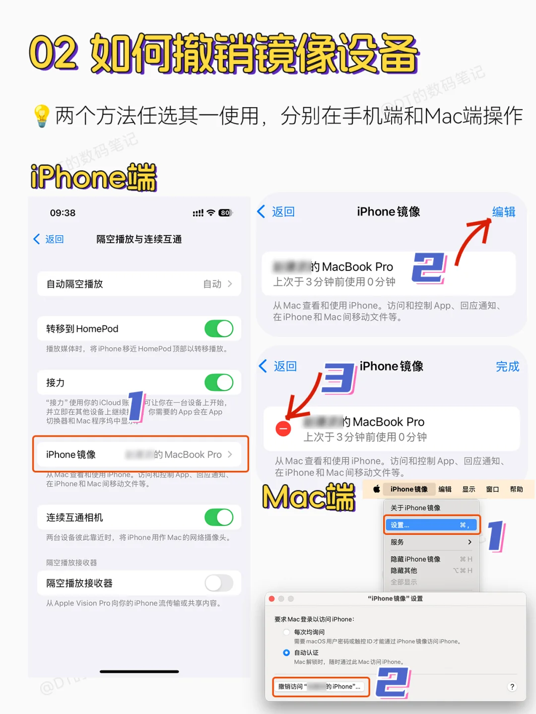Mac端:打开iPhone镜像时,点击左上方菜单栏iPhone镜像-设置-撤销访问iPhone