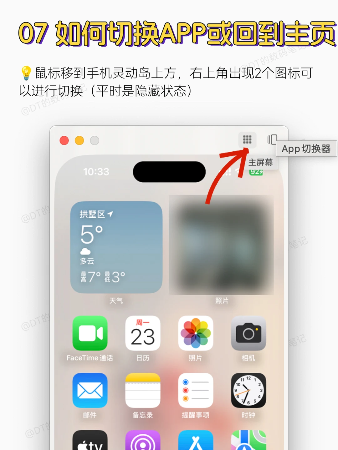 鼠标移到手机灵动岛上方,右上角出现2个图标可以进行切换