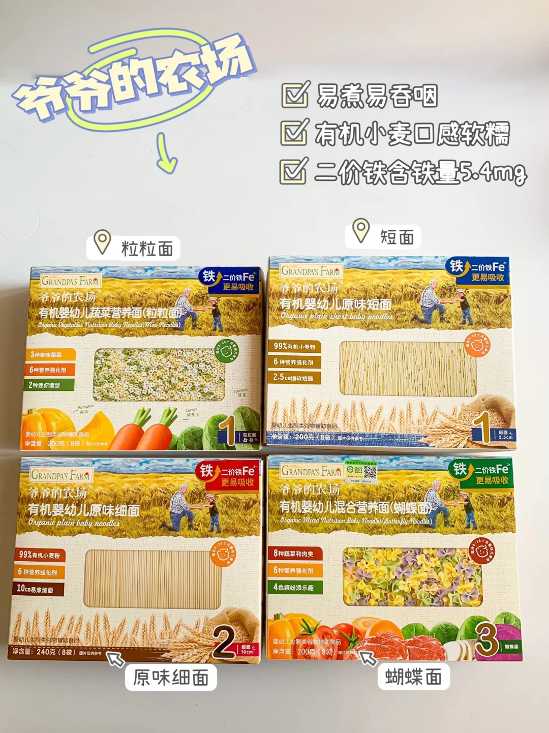 我家可乐吃的是爷爷的农场宝宝面条,他们家的面条种类多,对新手爸爸妈妈来说真的太友好了,不同月龄的不同造型都有,我这次入了短面、粒粒面、长直面、蝴蝶面,造型可爱,也很好煮,3-4分钟就可以吃了,搭配一些肉泥、菜泥,宝宝就很爱吃~