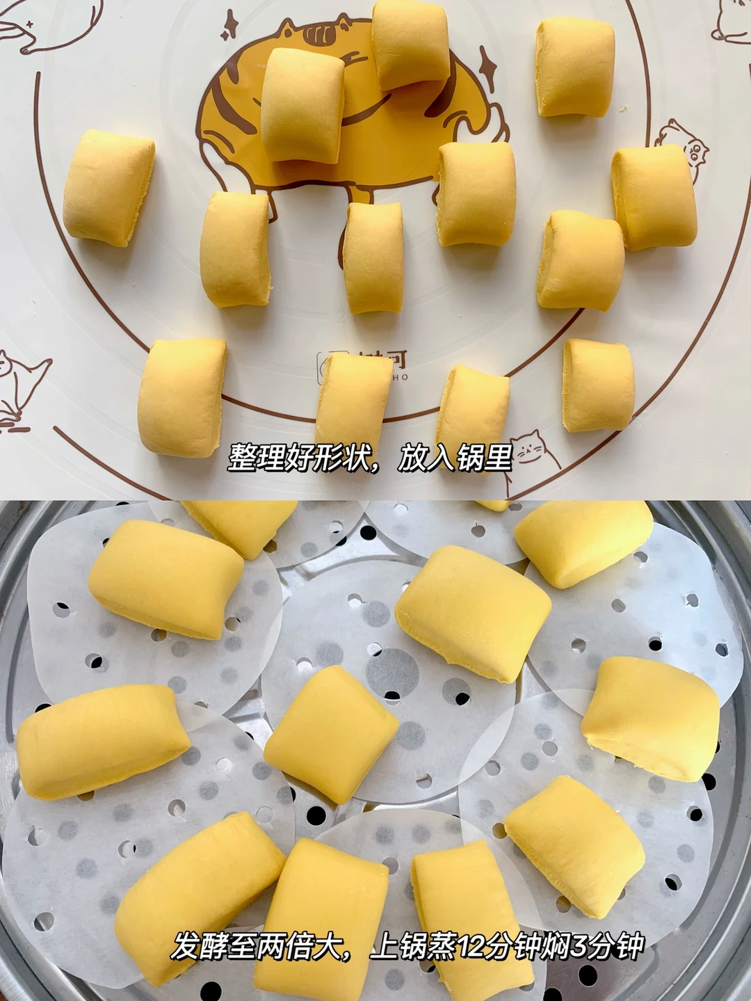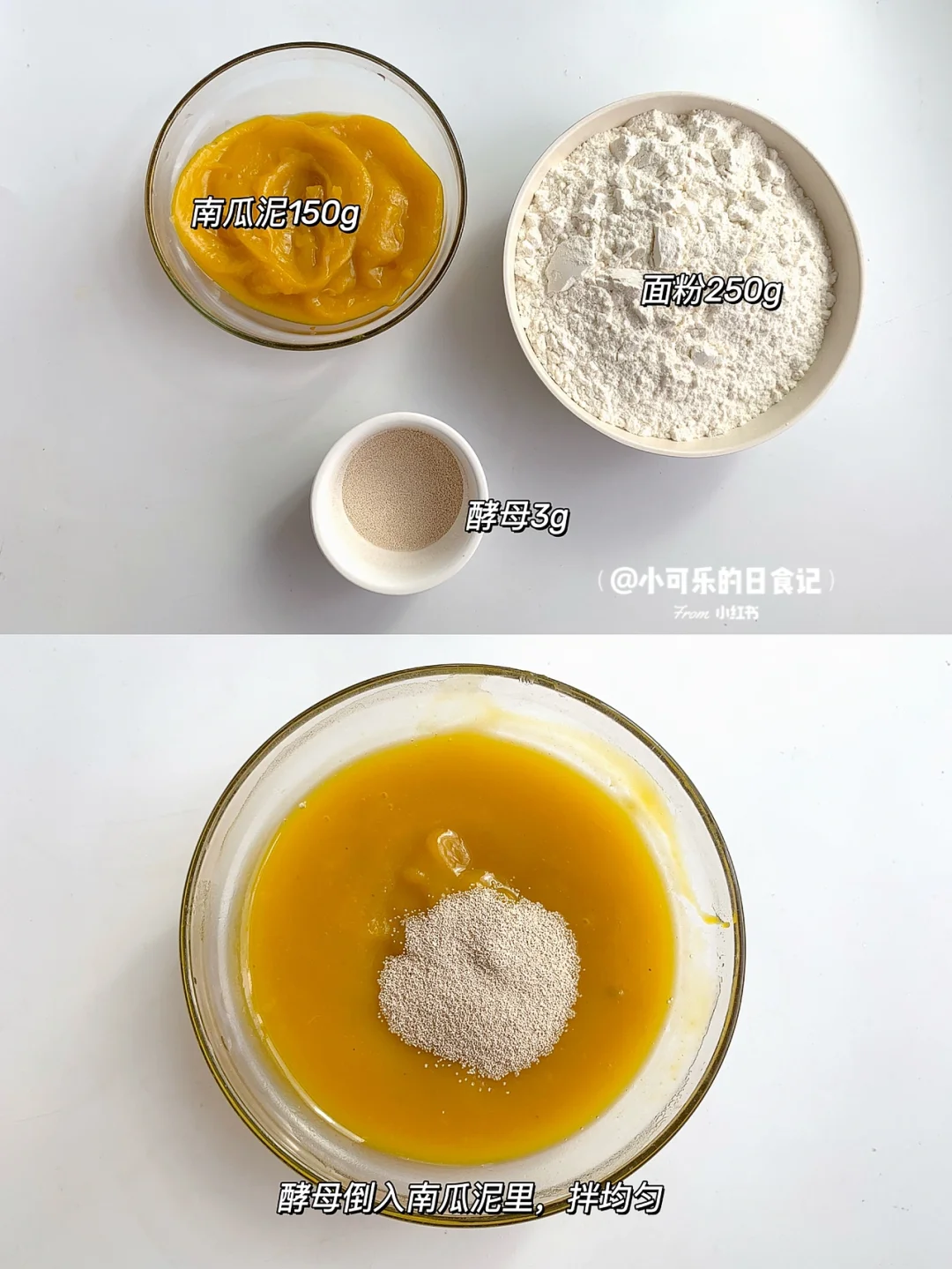 今天做的南瓜小馒头,松软香甜,一次发酵,做法也简单。小小一个,方便宝宝抓握,可以锻炼宝宝咀嚼能力,当作早餐或者主食都可以[赞R][赞R] . 🛒食材 南瓜泥150克 面粉250克 酵母3克 . 👩🍳做法: 1⃣️南瓜蒸熟,加少许配方奶或者水打成泥 2⃣️把酵母倒入南瓜泥里,搅拌均匀,再倒入面粉里,用筷子搅拌成絮状,然后揉成光滑的面团 3⃣️光滑的面团搓成长条,切成剂子,放入蒸笼里发酵至两倍大,蒸12分钟焖3分钟就可以啦