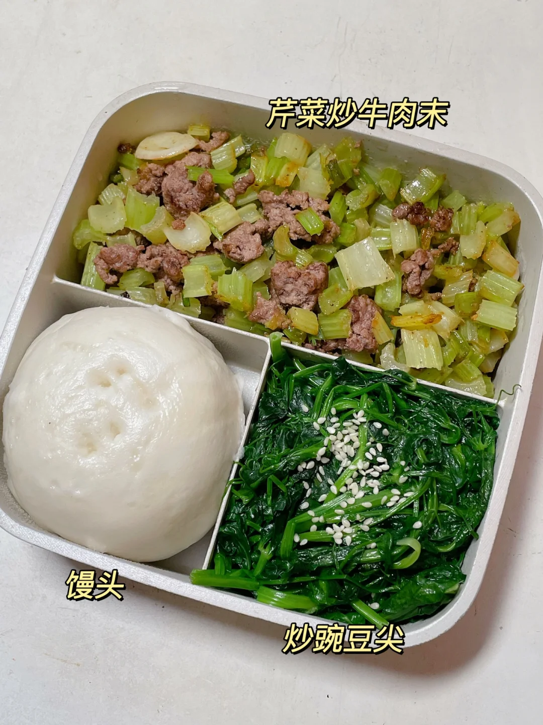 📍馒头+芹菜炒牛肉末+炒豌豆尖