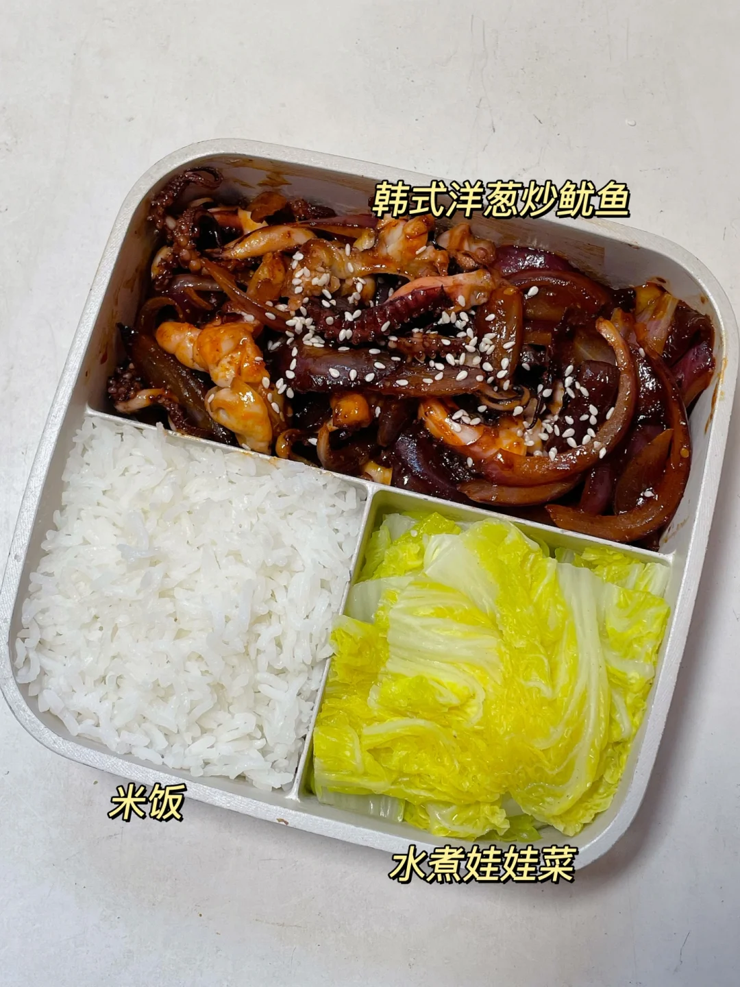 📍米饭+韩式洋葱炒鱿鱼+水煮娃娃菜