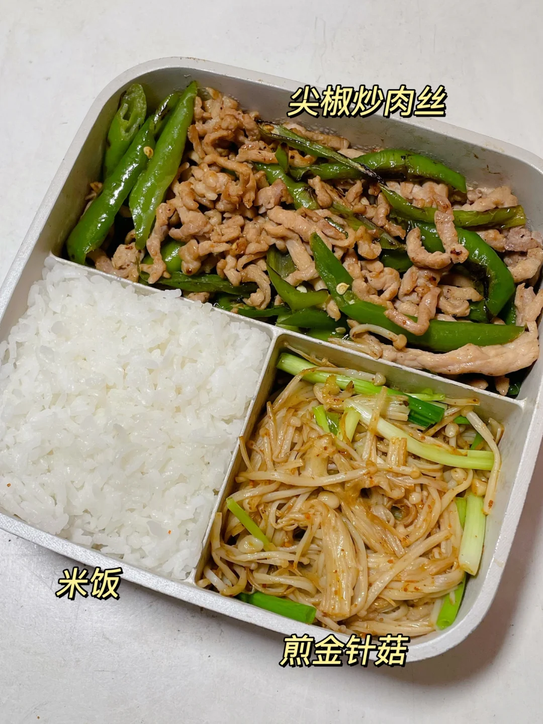 📍米饭+尖椒炒肉丝+煎金针菇