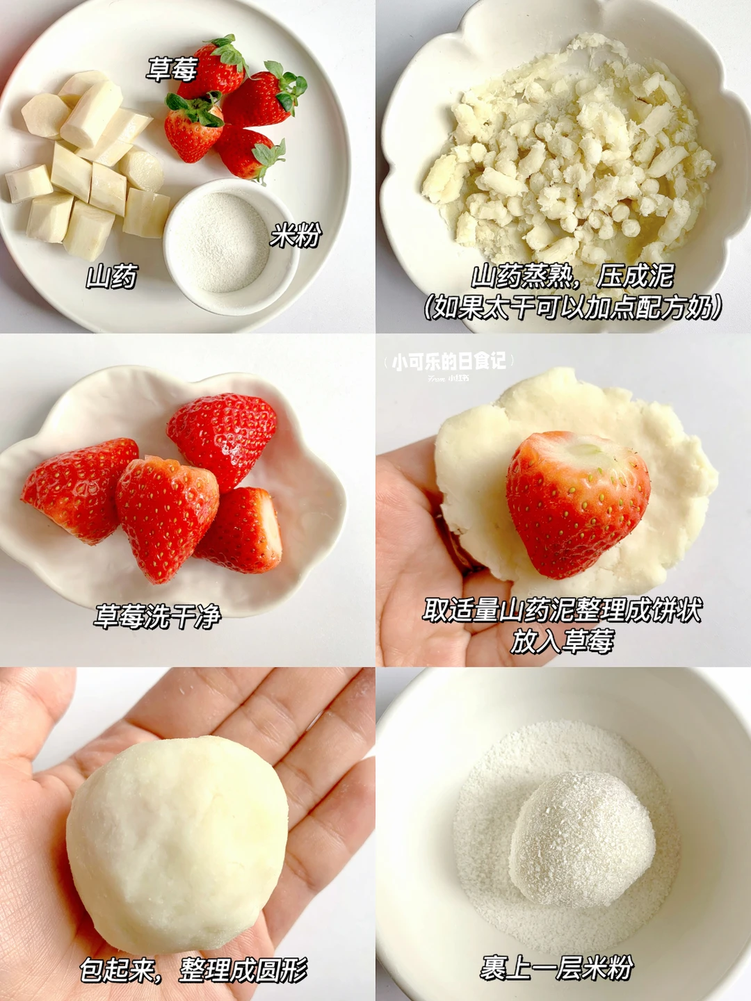 没有小朋友会不爱吃草莓的吧🍓,今天分享可乐平时会吃的草莓大福,又简单又好吃,还可以锻炼宝宝抓握能力。 - 🌟食材: 铁棍山药适量 草莓适量 米粉或者椰蓉 . 🌟做法: 1⃣️山药去皮切块上锅蒸熟*,趁热压成泥(如果太干可以加点配方奶) 2⃣️草莓盐水浸泡好洗净去叶子,取一小块山药泥滚成球后压扁,将一颗草莓包裹在中间 3⃣️滚圆后外层裹一圈米粉即可 🌈一切为二,颜值爆表 爱了爱了 可乐一口接一口可以吃好几个。