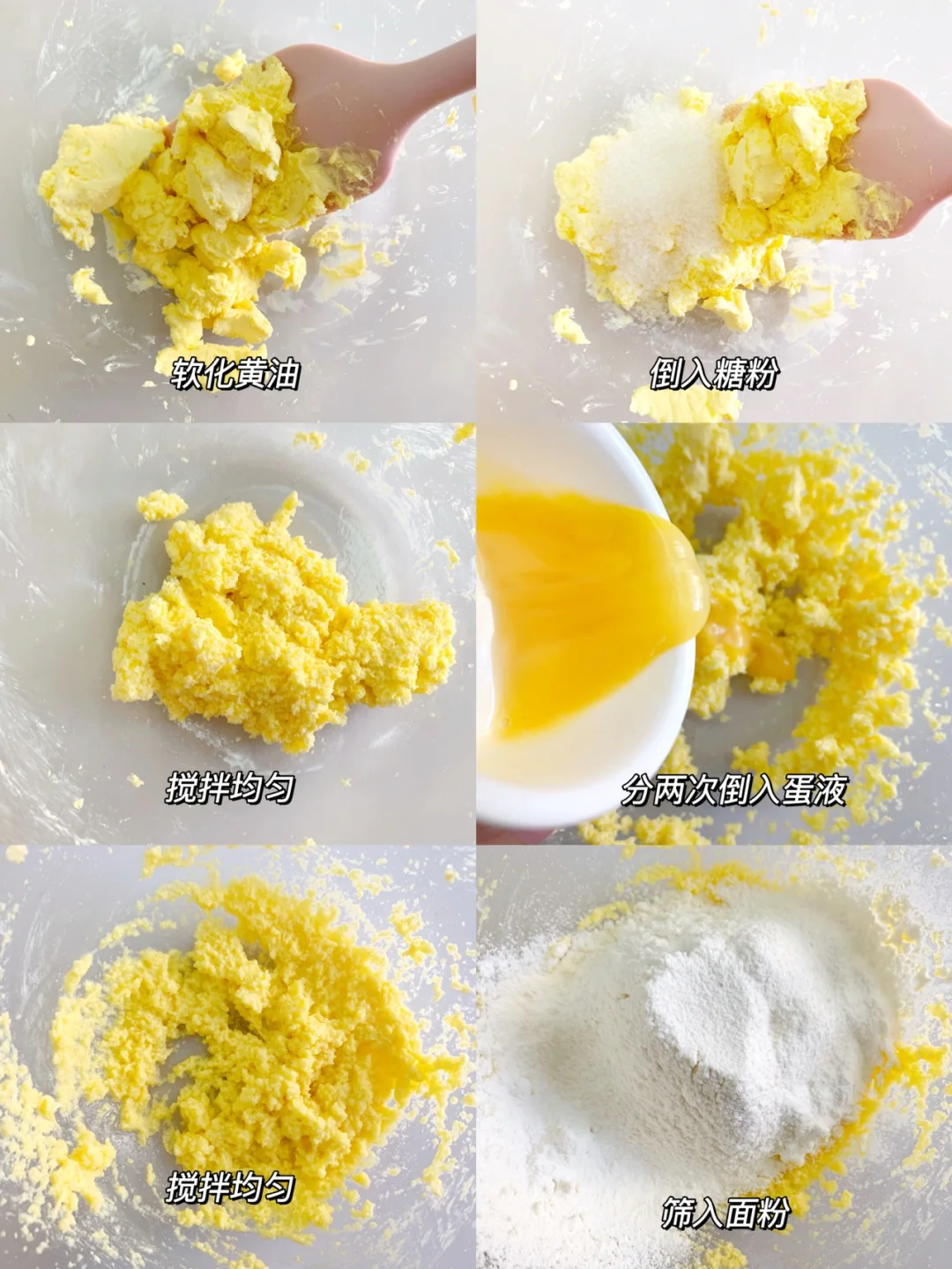 1⃣️黄油软化(用手按能轻松按出手印)加入糖粉,搅拌均匀,分两分加入蛋液,搅拌均匀