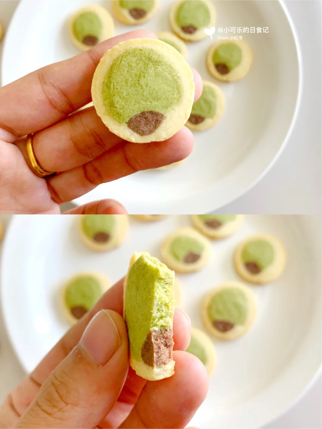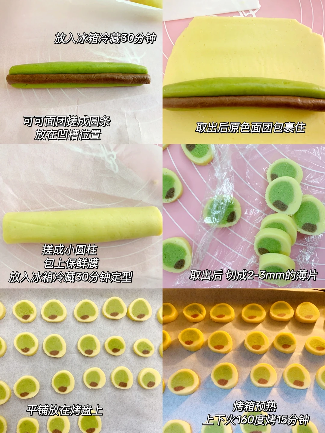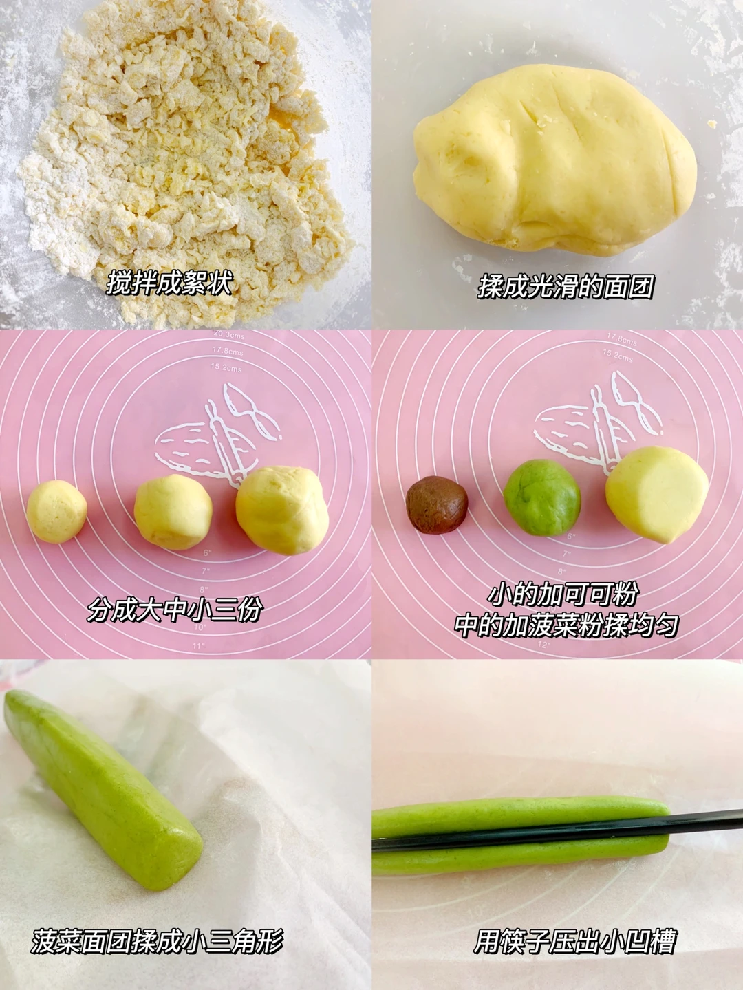 3⃣️面团分成大中小三份,中份加入菠菜粉揉均匀,小的加入可可粉揉均匀