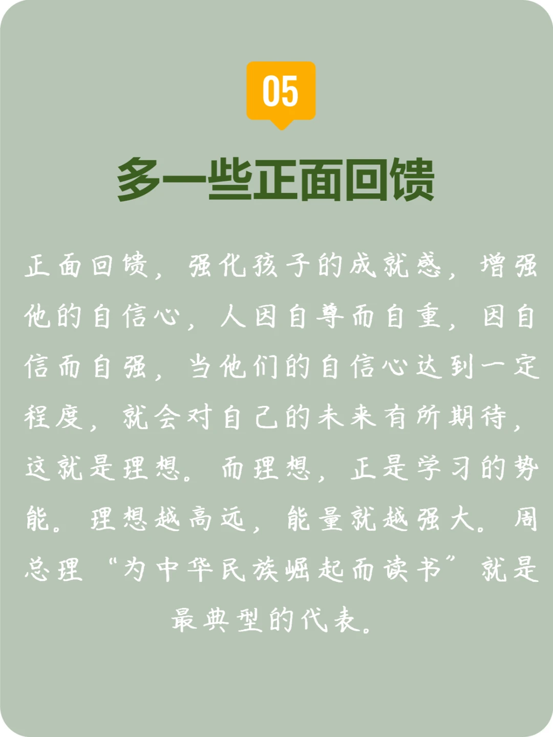 正面回馈,强化孩子的成就感,增强他的自信心,人因自尊而自重,因自信而自强,当他们的自信心达到一定程度,就会对自己的未来有所期待,这就是理想。而理想,正是学习的势能。理想越高远,能量就越强大。
