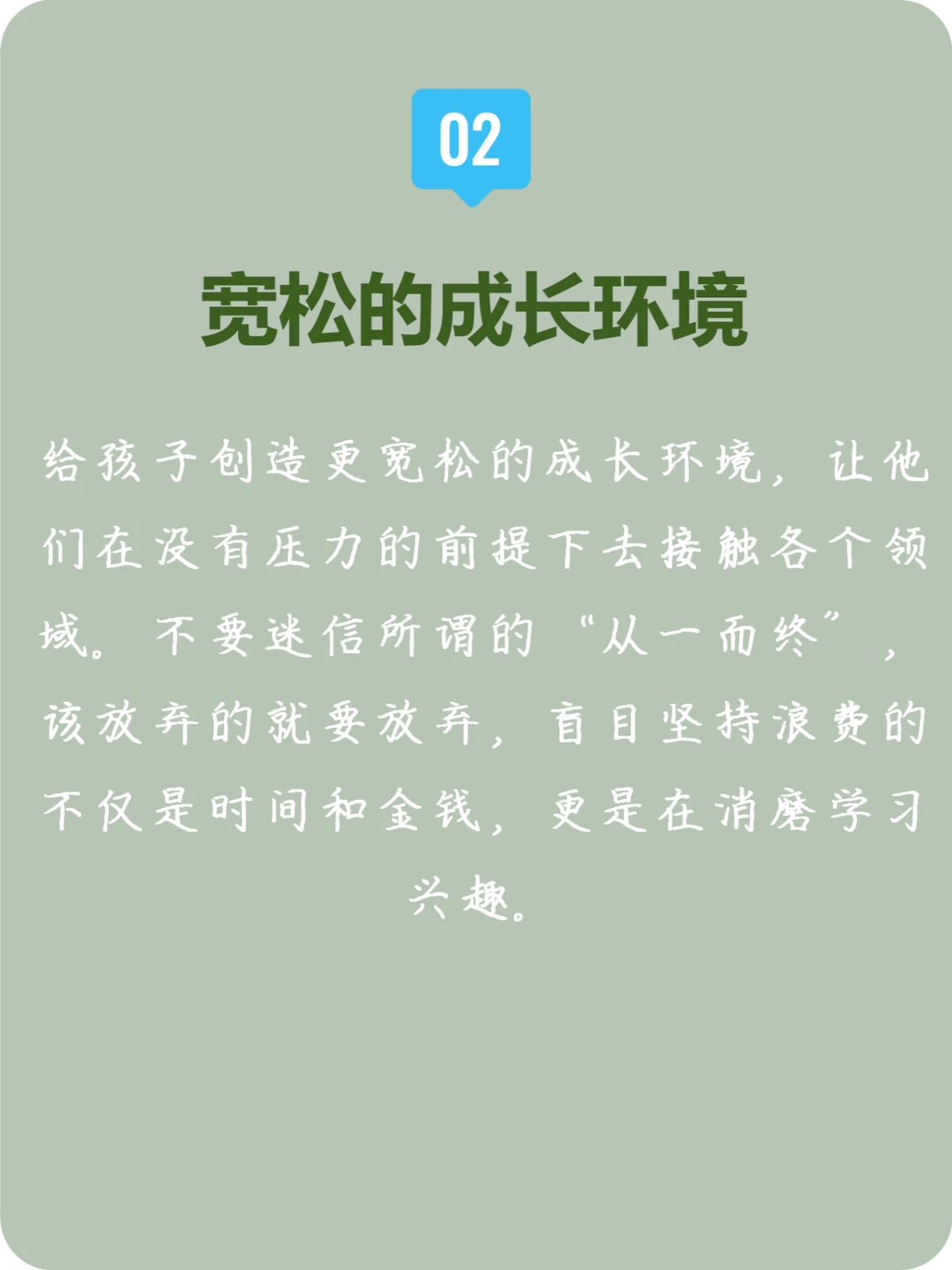 给孩子创造更宽松的成长环境,让他们在没有压力的前提下去接触各个领域。不要迷信所谓的“从一而终”,该放弃的就要放弃,盲目坚持浪费的不仅是时间和金钱,更是在消磨学习兴趣。