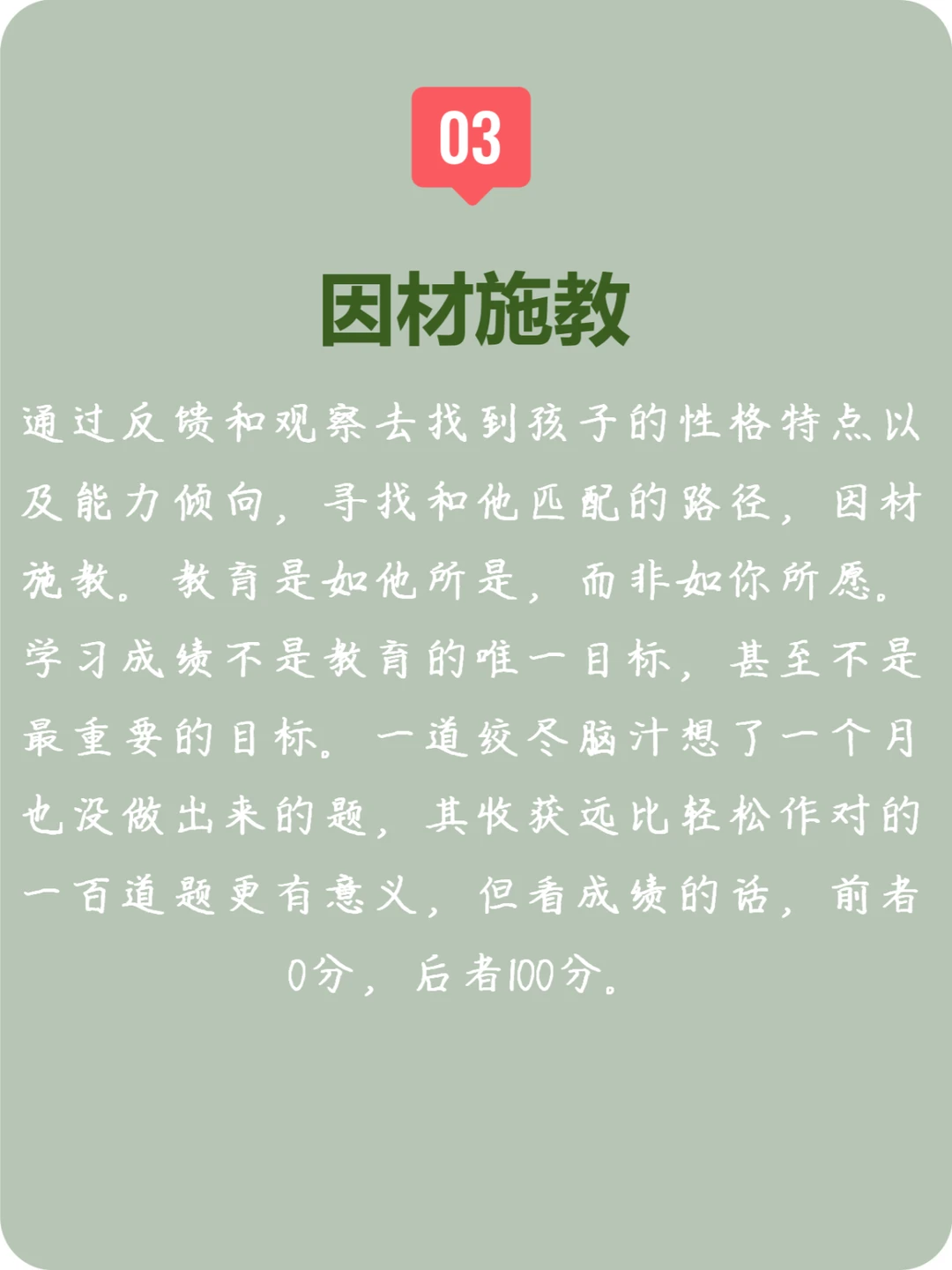 通过反馈和观察去找到孩子的性格特点以及能力倾向,寻找和他匹配的路径因材施教。教育是如他所是,而非如你所愿。学习成绩不是教育的唯一目标,甚至不是最重要的目标。做题最有价值的部分是思考的过程,而不是得出结果。一道绞尽脑汁想了一个月也没做出来的题,其收获远比轻松作对的一百道题更有意义,但看成绩的话,前者0分,后者100分。