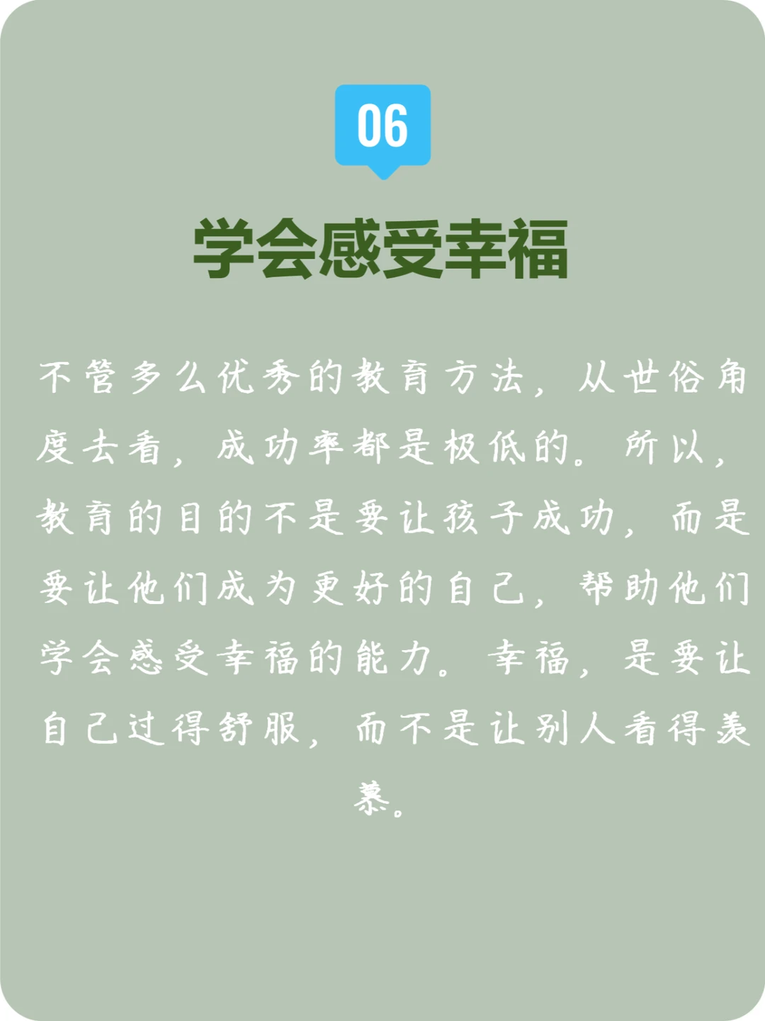 不管多么优秀的教育方法,从世俗角度去看,成功率都是极低的。所以,教育的目的不是要让孩子成功,而是要让他们成为更好的自己,帮助他们学会感受幸福的能力。幸福,是要让自己过得舒服,而不是让别人看得羡慕。