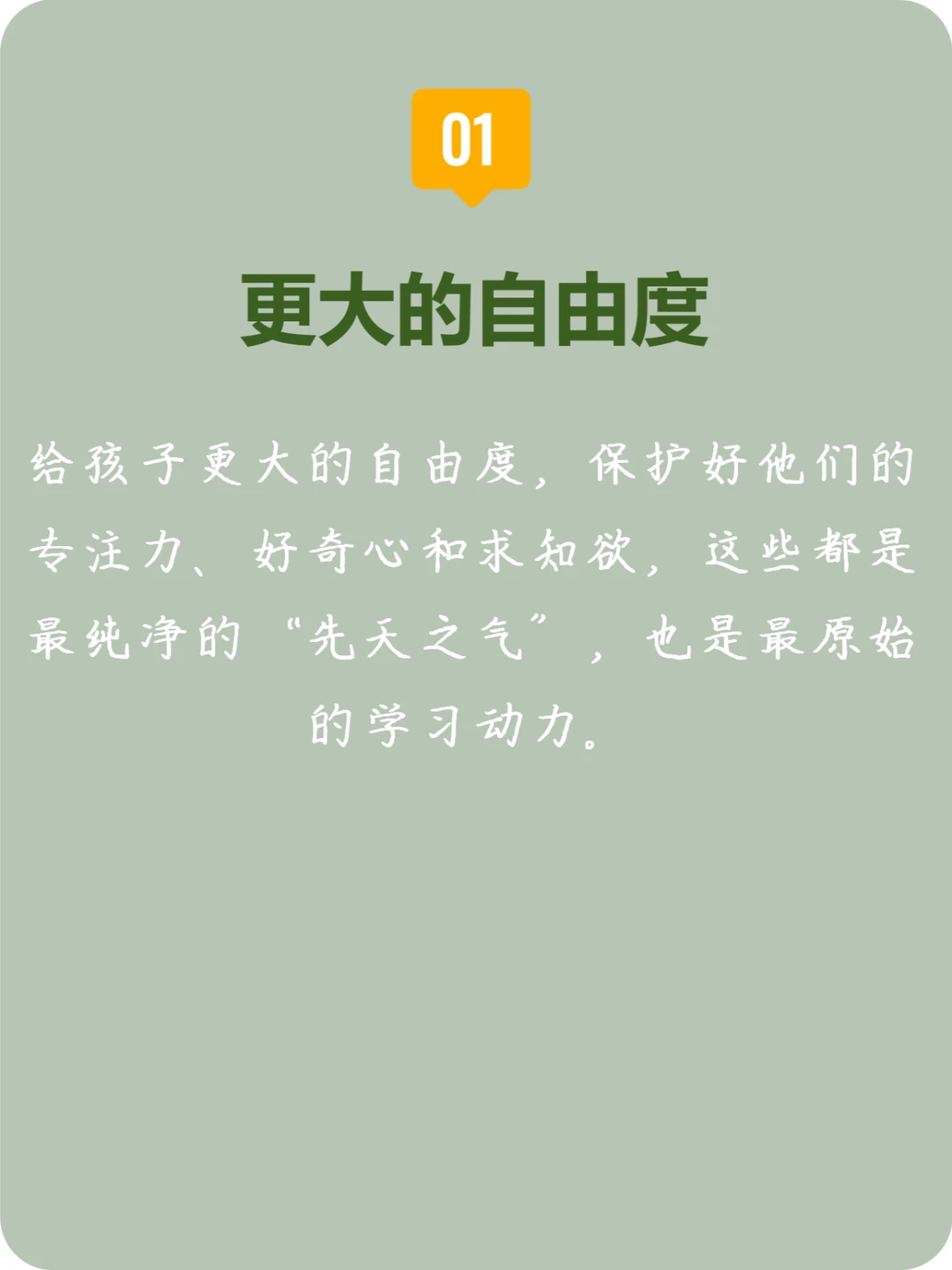 给孩子更大的自由度,保护好他们的专注力、好奇心和求知欲,这些都是最纯净的“先天之气”,也是最原始的学习动力。