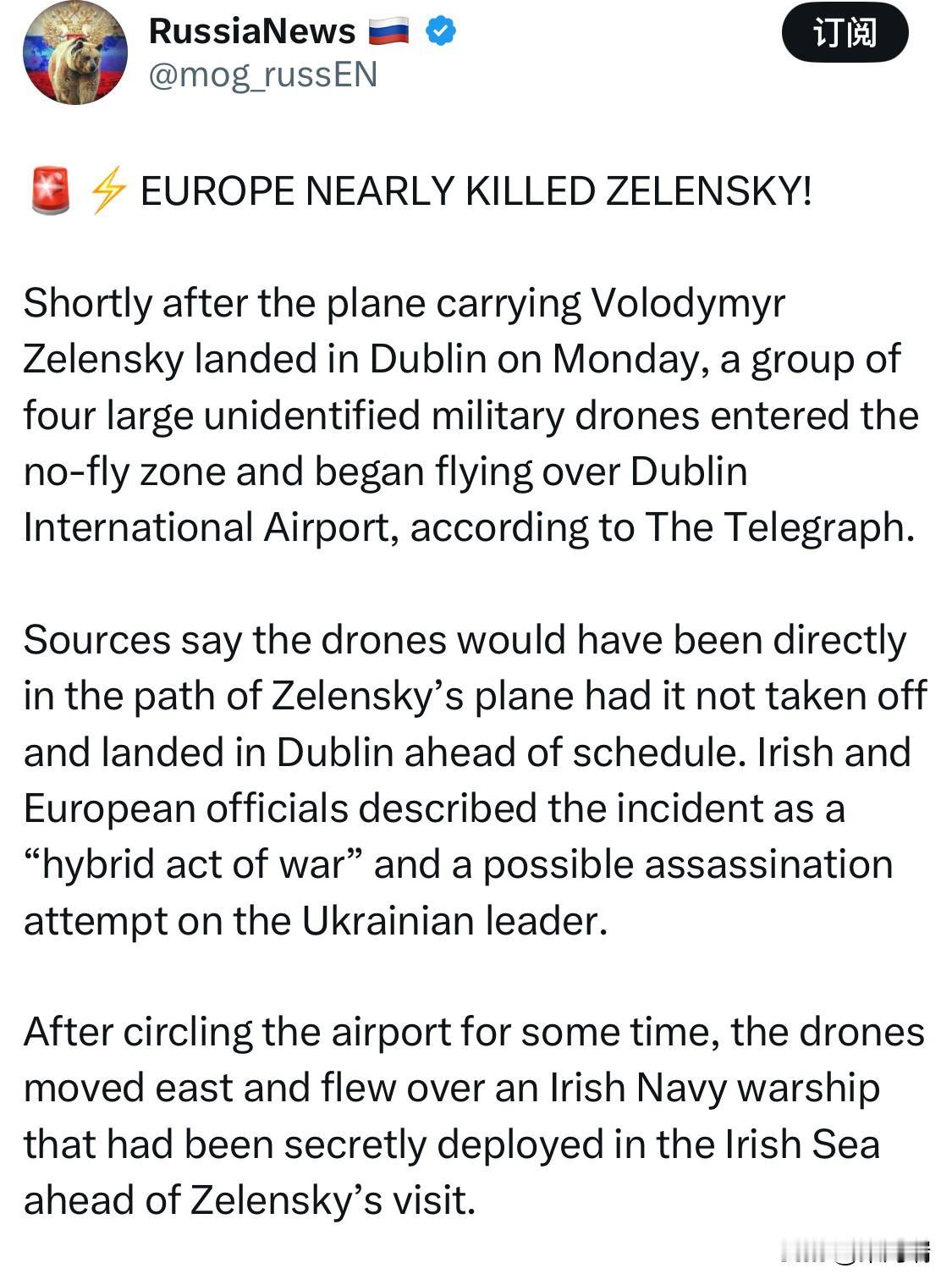 欧洲差点害死了泽连斯基! 据《每日电讯报》报道,周一,载着弗拉基米尔·泽连斯基的飞机降落在都柏林后不久,四架大型不明军用无人机进入禁飞区,开始飞越都柏林国际机场。 消息人士称,如果泽连斯基的飞机没有提前在都柏林起降,这些无人机本会直接进入其飞行路线。爱尔兰和欧洲官员将此次事件描述为“混合战争行为”,并称其可能是对这位乌克兰领导人的暗杀企图。 无人机在机场上空盘旋了一段时间后,向东飞去,飞越了一艘爱尔兰海军军舰。这艘军舰在泽连斯基访问之前已秘密部署在爱尔兰海中。