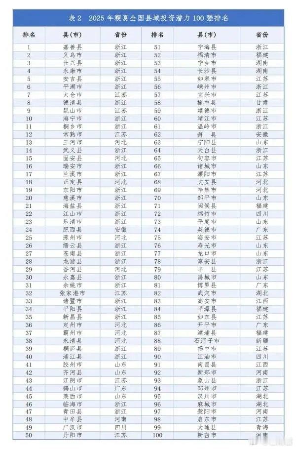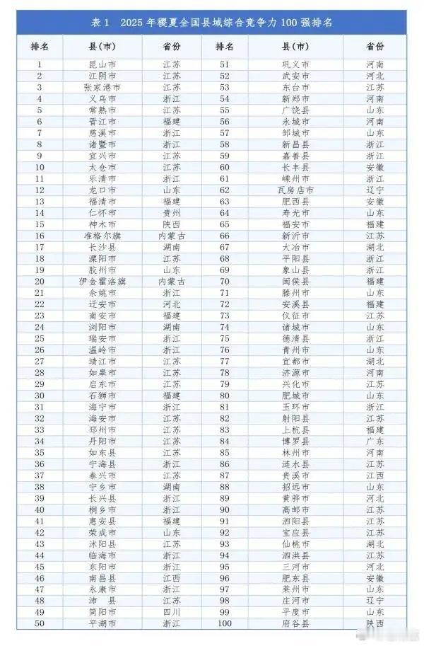 2025年全国县域经济综合竞争力百强出炉:苏浙鲁“三足鼎立”,“千亿县”已达60个!12月2日,稷夏全国县域综合竞争力和投资潜力百强县市榜单发布。榜单由稷夏智库受权根据中国社会科学院财经战略研究院《中国县域经济发展报告》指标体系编制而成。随榜单同时发布的还有基于全国400样本县(市)的县域经济研究报告。一份县域竞争力榜单,以数字化排名呈现发展成效。昆山、江阴、张家港包揽前三,前十名中苏浙两省独占十席,百强中占比近六成——数据清晰指向长三角地区县域经济的强劲活力。然而,榜单背后揭示的不仅是区域发展的不平衡,更是中国县域经济现代化转型的深层逻辑。江浙县域的崛起,是改革开放以来市场力量与制度创新协同作用的结果。苏南的“园区经济”与浙江的“块状经济”各具特色,却共享着民营经济活跃、产业链完整、营商环境优化的共同基因。昆山从农业县到电子信息产业高地的蜕变,义乌从鸡毛换糖到全球小商品之都的跃升,无不印证了县域作为中国经济毛细血管的韧性与创造力。这些“头部县域”的成功,是市场在资源配置中决定性作用与政府积极作为相结合的生动写照。县域竞争力的区域差异,本质上反映了市场化程度、产业承接能力与公共服务水平的梯度差距。中西部县域如何借鉴东部经验,培育内生动力?资源型县域如何摆脱路径依赖,实现产业多元?这些问题远比排名本身更为关键。更重要的是,县域发展的价值评判,不应止步于经济指标。在共同富裕的语境下,县域竞争力更应体现为居民的获得感、幸福感与安全感。能否提供优质的教育医疗资源?能否营造宜居的生态环境?能否构建公平正义的法治环境?这些“隐性指标”才是县域可持续发展的真正基石!对此,你想说点什么呢?