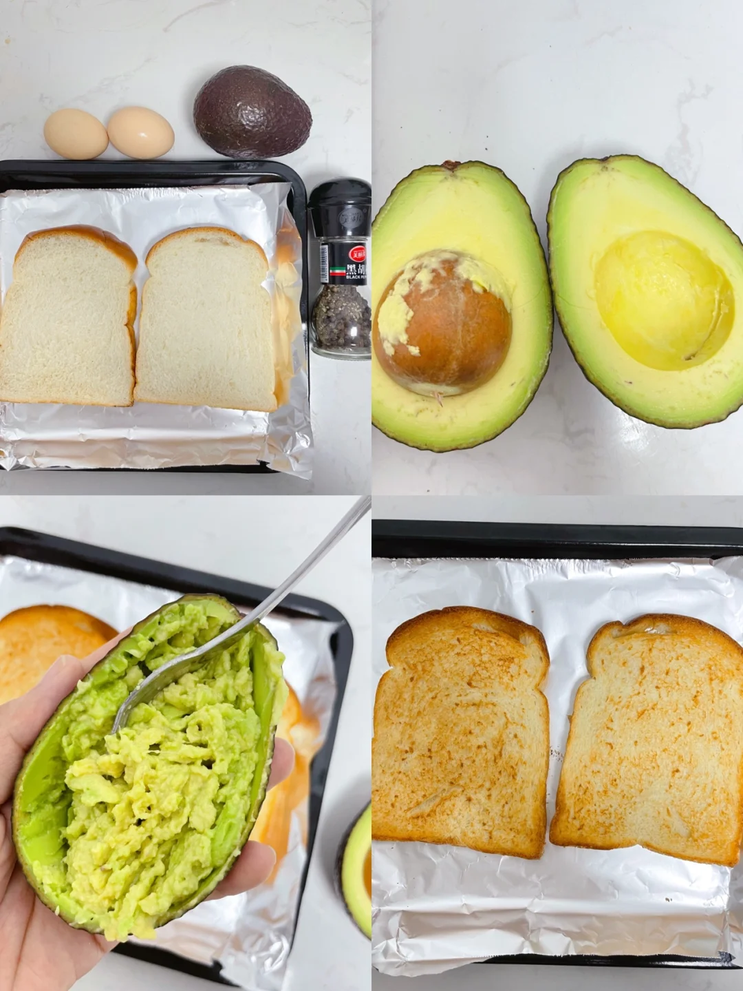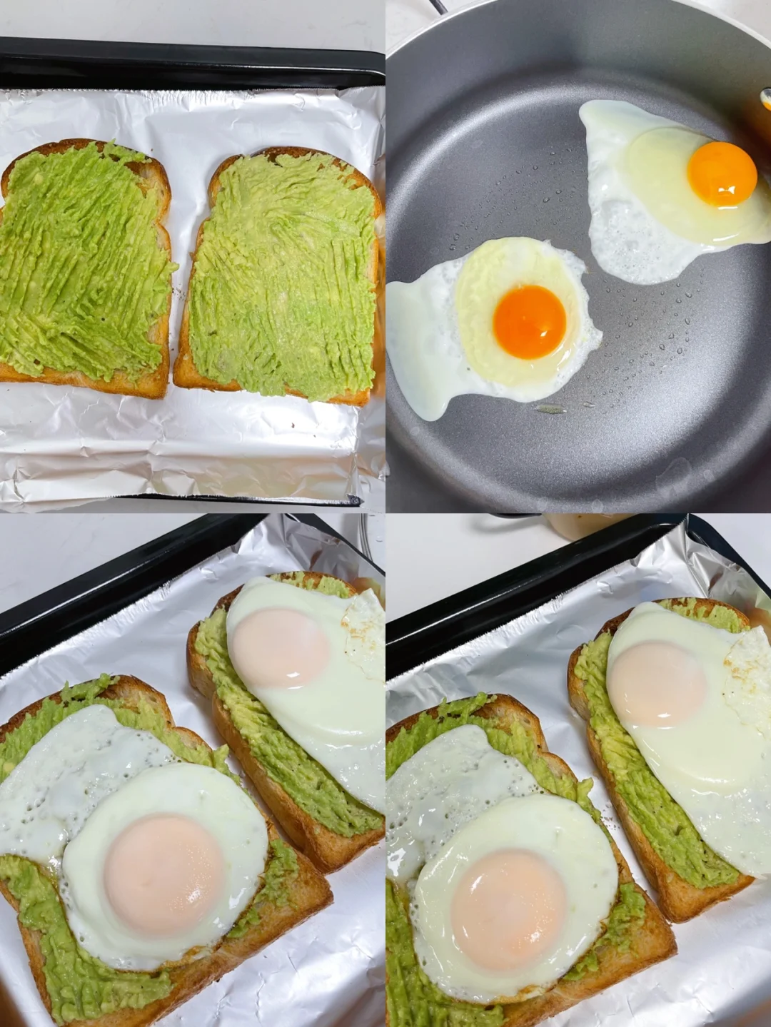 牛油果鸡蛋吐司 (这是我唯一能接受牛油果的吃法) 牛油果1个 吐司2片(建议用厚切吐司) 鸡蛋2个 黑胡椒少许 吐司160度烤箱烤3分钟,翻面再烤3分钟。 鸡蛋下锅煎熟,可以选择无菌蛋煎半熟。不要问为什么,问就是照做[萌萌哒R] 牛油果捣成泥抹在吐司上,撒上黑胡椒,盖上煎好的鸡蛋。 完成✅