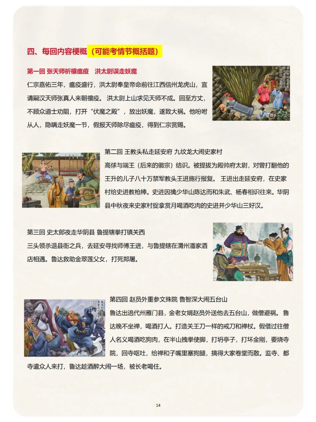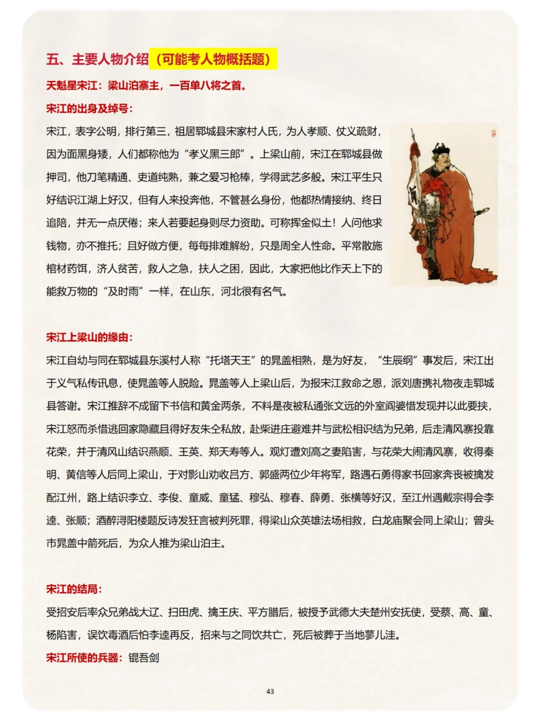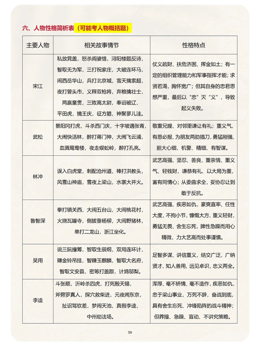 《水浒传》最常考的是主要人物的核心事件和形象,一定要记忆重点人物的性格和每回内容概要。