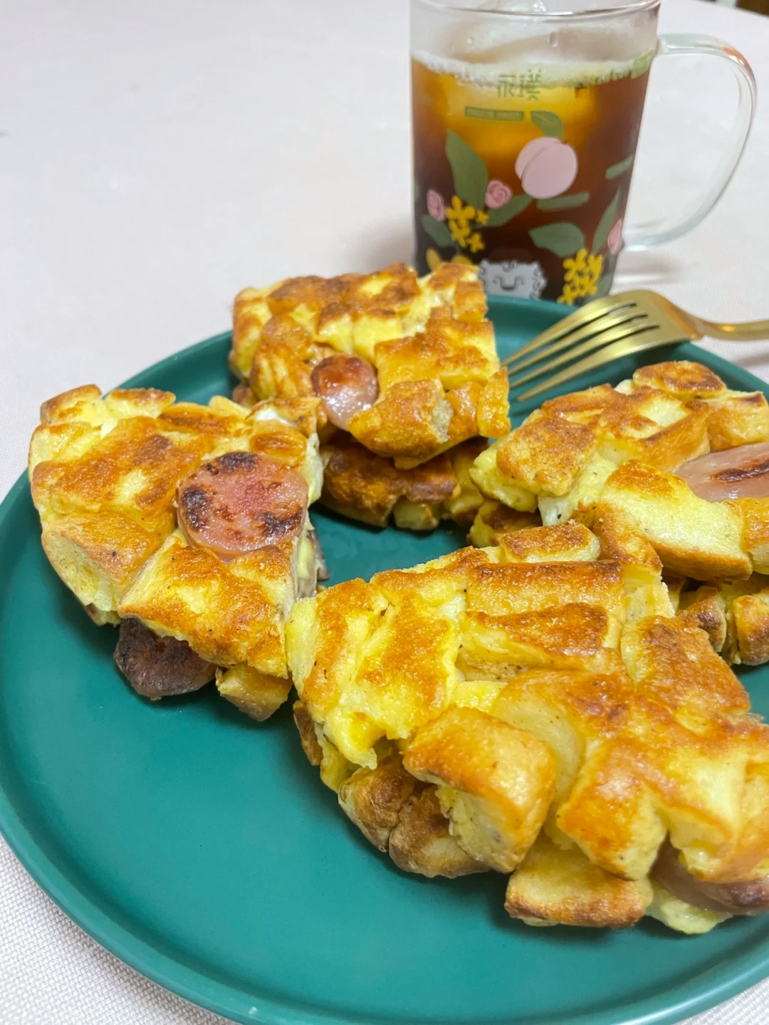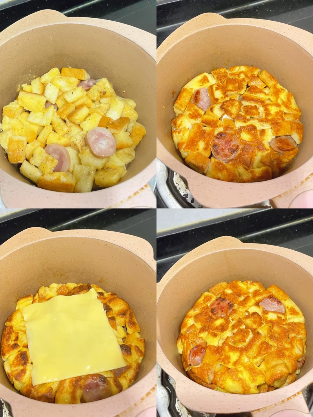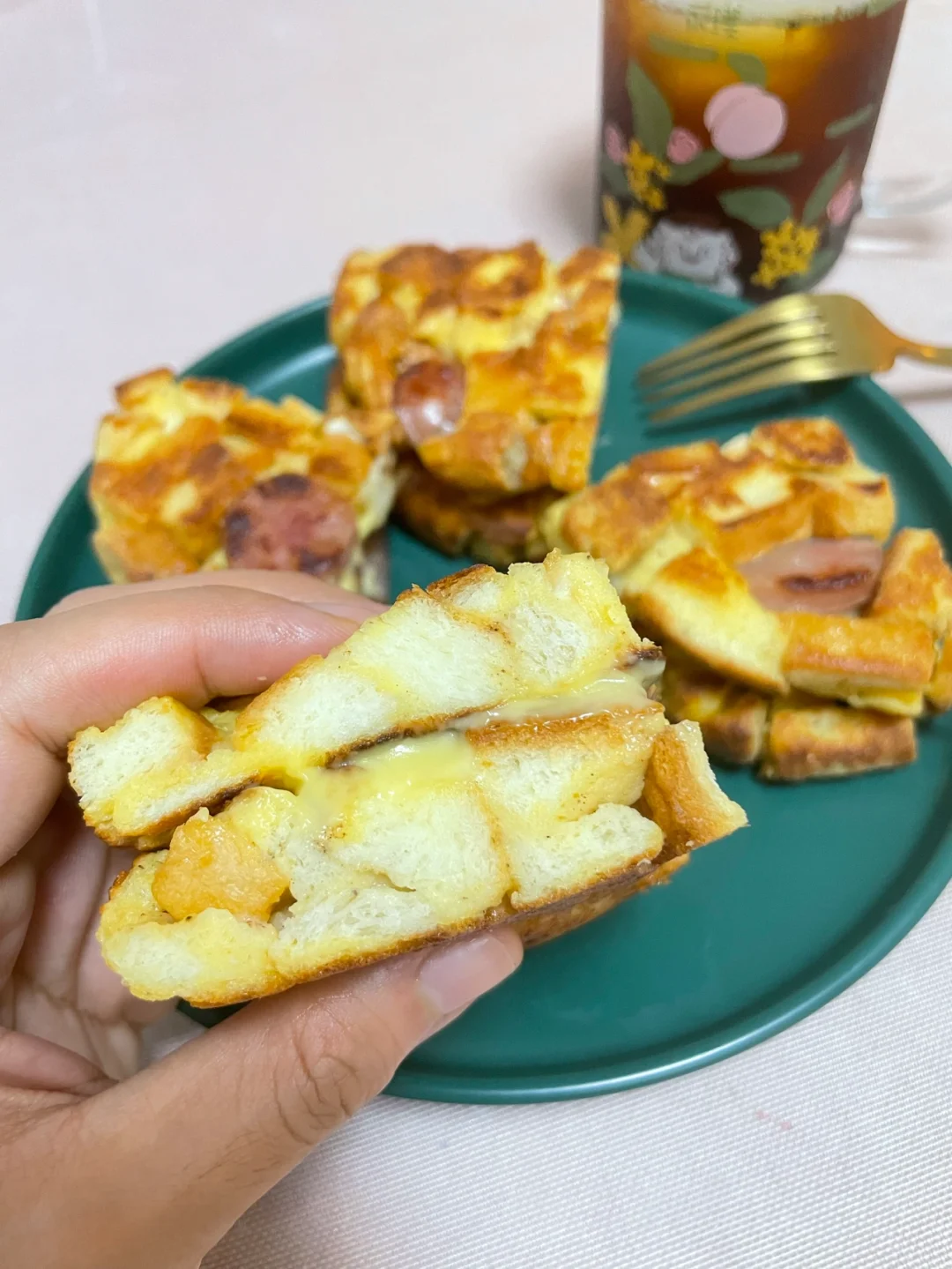 吐司华夫饼 吐司3片 鸡蛋2个 芝士片,香肠各1 五香粉,黑胡椒适量(有葱花更佳) 吐司切丁,香肠切丁,鸡蛋打散。所有的材料混合均匀。 混合均匀的材料分两次下入喷好油的不粘锅内煎定型煎至两面金黄。 趁两块煎好的饼皮还热的时候把芝士放入两块饼皮中间。 完成✅ 面包的量和鸡蛋的量在混合的时候可以稍作调整,确保每颗吐司丁表面都粘上鸡蛋液,这样才能煎定型。如果喜欢吃酱的宝宝出锅后可以挤上番茄酱和沙拉酱也会很好吃哦。😋