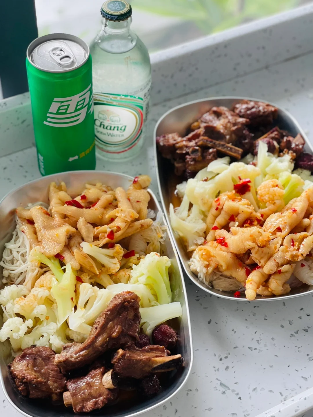 杨梅顿排骨 水煮花菜,金针菇,魔芋结 酸辣无骨鸡抓