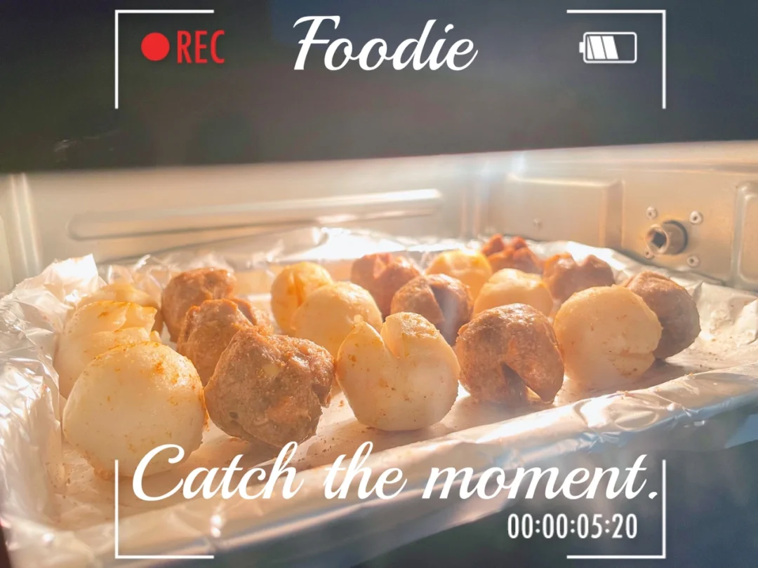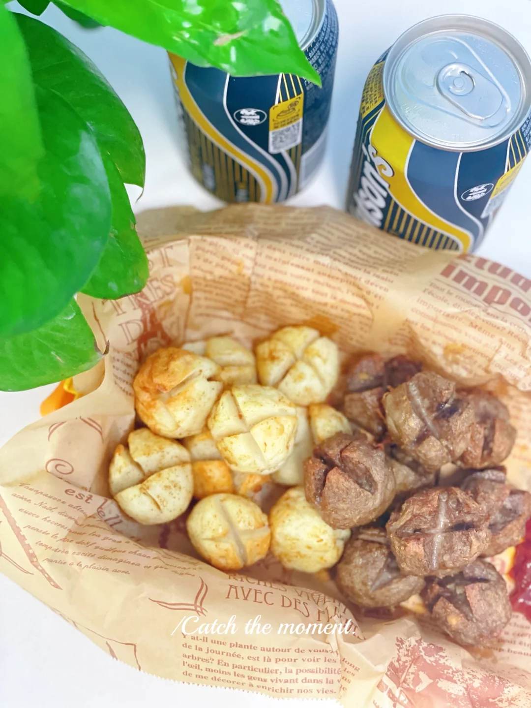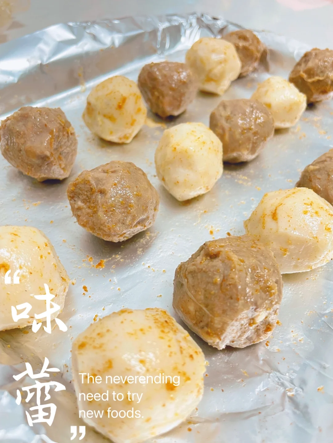 墨鱼丸牛肉丸划开十字,加上橄榄油孜然粉 空气炸,160度10分钟。 配上番茄酱沙茶酱就是一份高级的下午茶了。
