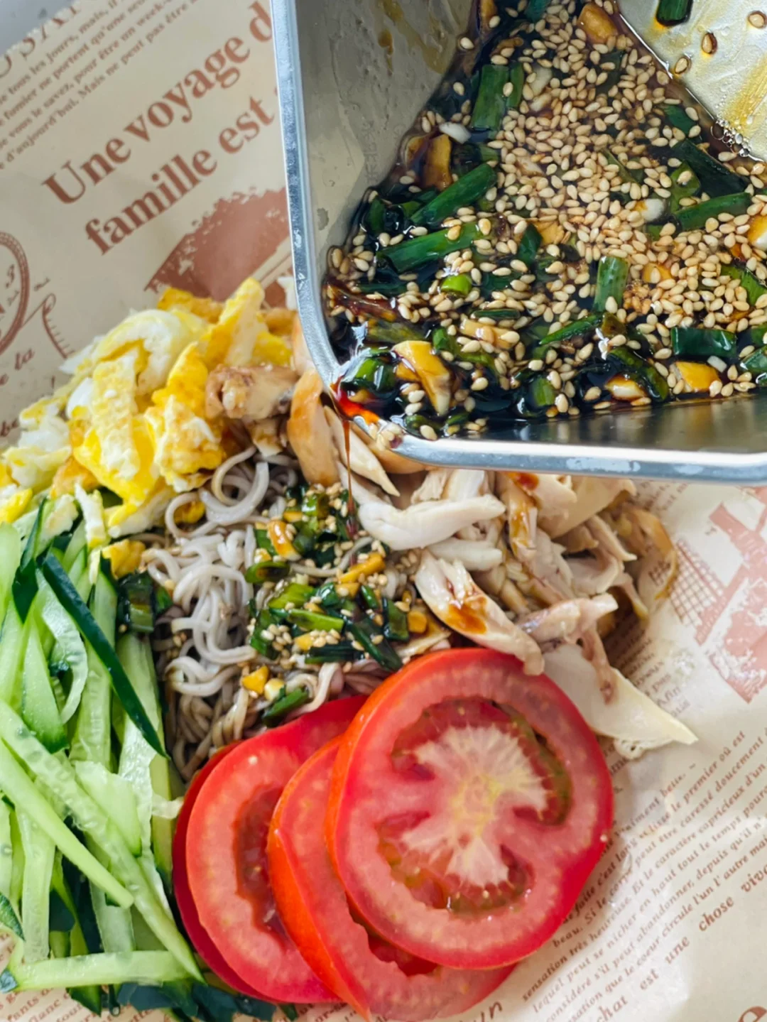 鸡腿肉荞麦冷面 鸡腿,鸡蛋,黄瓜,西红柿 酱油,蚝油,醋,芝麻,葱,蒜