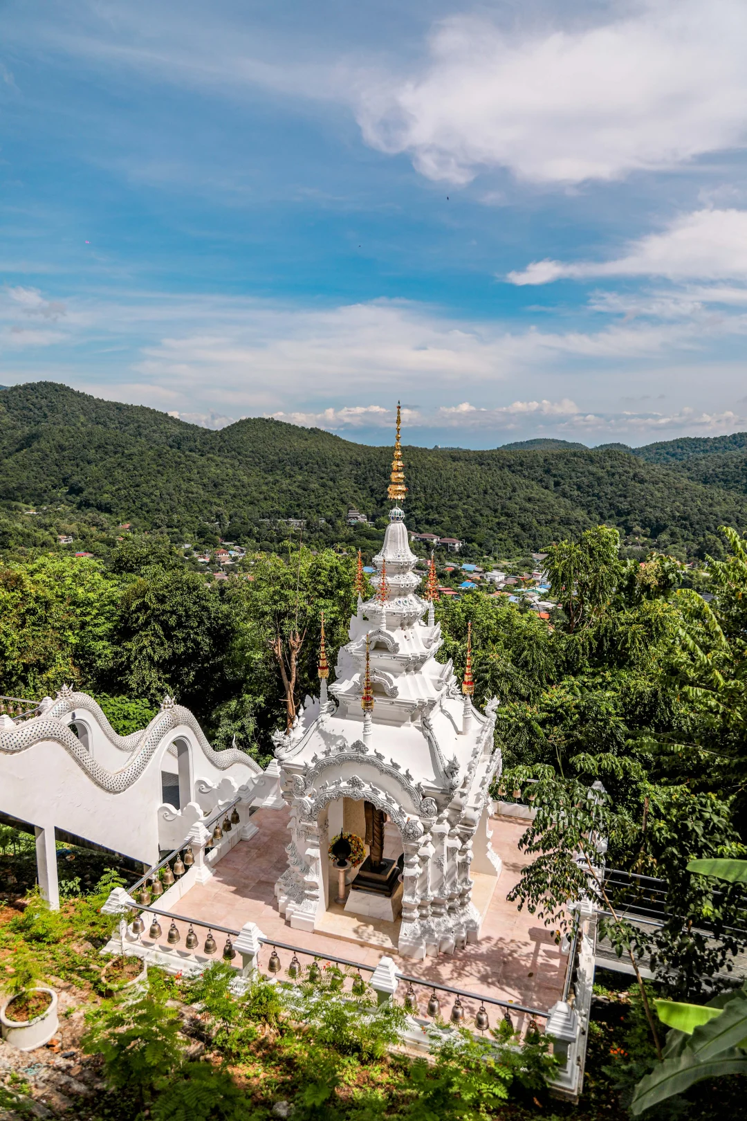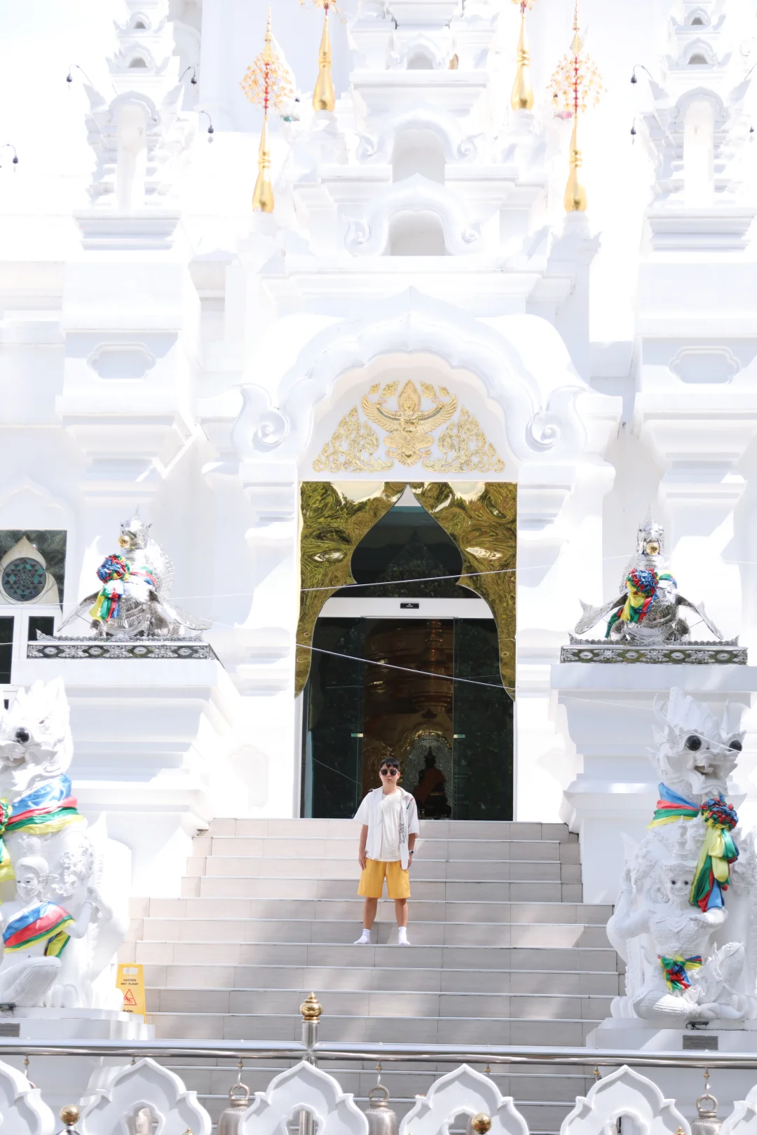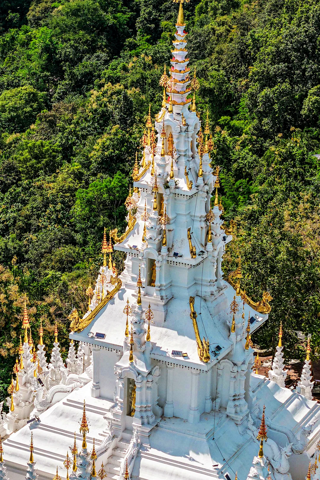 和因他拉瓦寺相距不远,打车10分钟可达!山顶的金属城堡佛塔超震撼,白色基座+镀金塔尖,在青山环绕下格外神圣。傍晚时分阳光洒在金属塔身,光影绝了,站在观景台还能俯瞰清迈群山,寺庙氛围静谧又治愈。