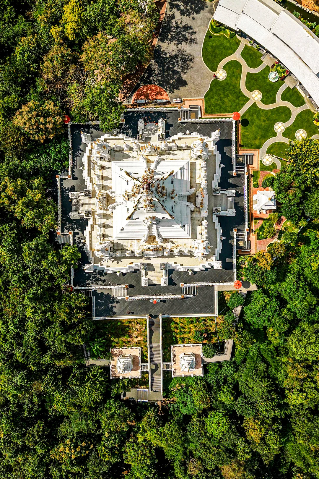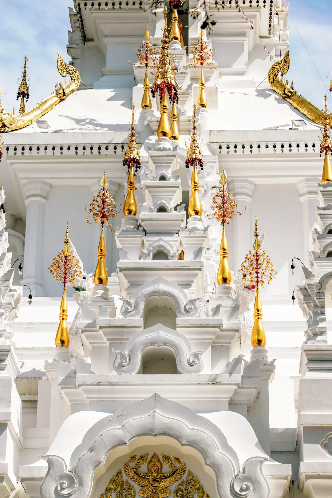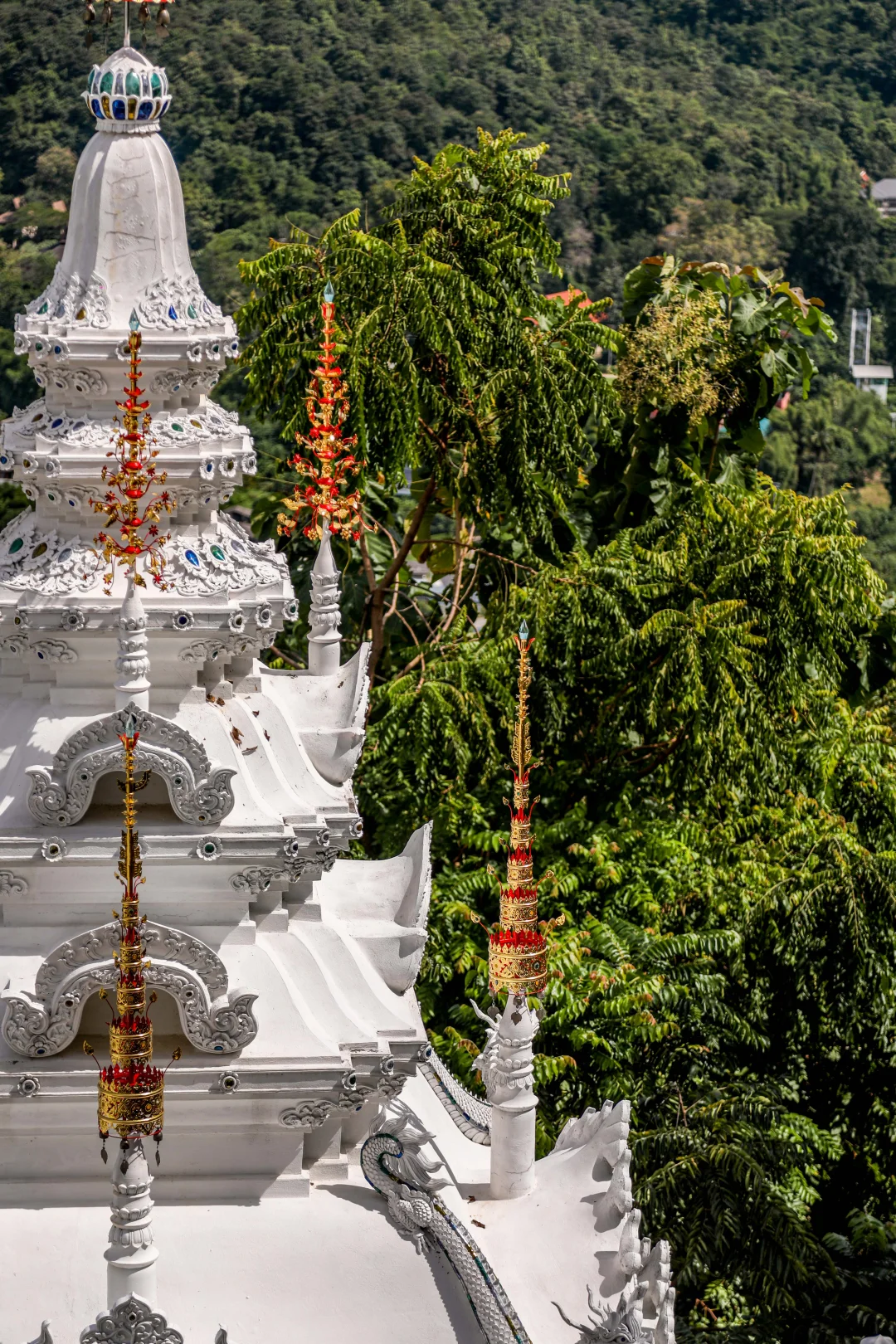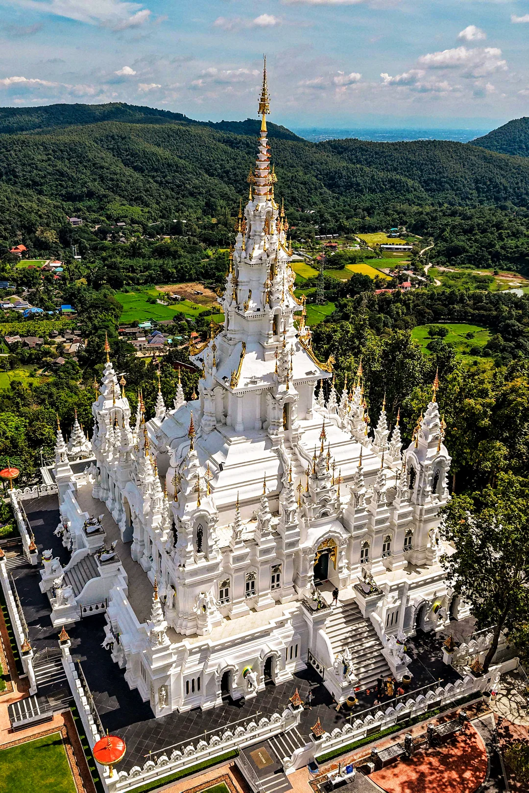 和因他拉瓦寺相距不远,打车10分钟可达!山顶的金属城堡佛塔超震撼,白色基座+镀金塔尖,在青山环绕下格外神圣。傍晚时分阳光洒在金属塔身,光影绝了,站在观景台还能俯瞰清迈群山,寺庙氛围静谧又治愈。