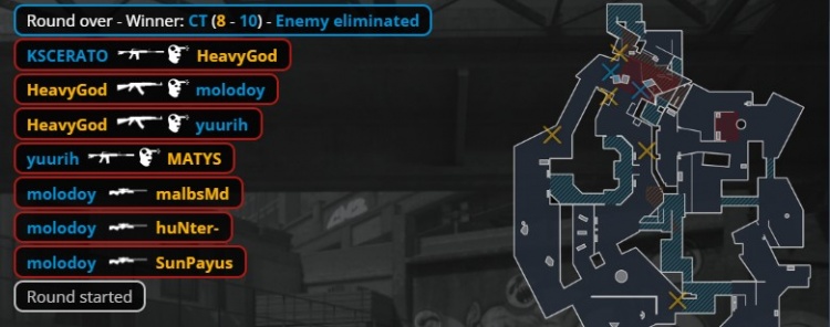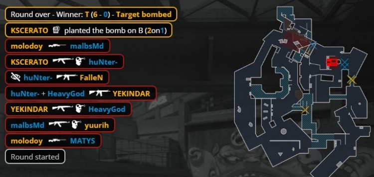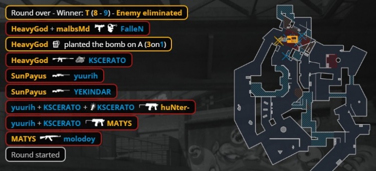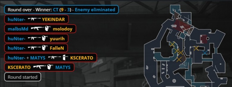 后续太阳神大狙发力,单局三杀+双杀帮助G2连拿2分,但黑豹反手连拿2分。半场前最后一回合,hunter爆轰四杀,G2以3-9结束上半场。