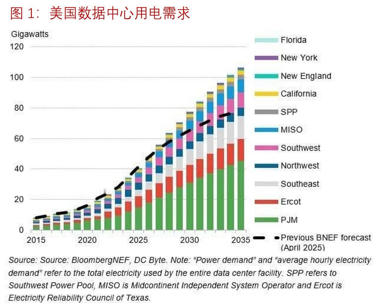 彭博新能源财经预测,未来十年美国的数据中心电力需求量可能大幅增长 彭博新能源财经周一表示,到 2035 年,美国数据中心的电力需求可能将达到 106 吉瓦。这是迄今为止较为激进的用电量增长预测之一。该报告发布之际,一些能源行业分析师和高管警告称,人工智能泡沫或数据中心的投机性提议可能正在推高过高的用电量增长预期。 Grid Strategies上个月发布的一份报告称,有关到 2030 年数据中心负荷将额外增加 90 吉瓦的公用事业预测可能过高;市场分析表明,在这一时间段内,负荷增长可能更接近 65 吉瓦。 美国能源部 7 月份的一份报告估计,到 2030 年还需要新增 100 吉瓦的峰值发电容量,其中 50 吉瓦将用于数据中心。据劳伦斯伯克利国家实验室的数据,到 2028 年,这些设施可能会占到峰值用电量的 12%。 彭博新能源财经的数据中心项目追踪数据显示,该行业正在逐步拓展至传统数据中心中心区域之外的地区,比如弗吉尼亚州北部、亚特兰大市区以及俄亥俄州中部等地,这些地区由现有的光纤主干线路为数据传输服务。 一张正在建设中、已获批准以及处于早期阶段的项目地图显示,计划中的数据中心容量达数十亿瓦特,这些设施将从弗吉尼亚州和卡罗来纳州向南延伸,穿过宾夕法尼亚州东部,然后沿着密歇根湖岸从芝加哥向外扩展。此外,还计划在得克萨斯州和墨西哥湾沿岸各州建设更多的数据中心。 大部分的建设能力将集中在由PJM、MISO 和 ERCOT 监管的电网中。彭博新能源财经预测,仅 PJM监管的电网在未来五年内就可能新增 31 吉瓦的数据中心用电负荷,这一数字比新发电设施的预期新增容量还要高出约 3 吉瓦。 随着用电量的预期大幅增长,北美电力可靠性公司去年年底曾发出警告,称今年以及未来几年(直至 2026 年及以后)在所有三个地区都存在“夏季电力供应短缺”的较高风险。 然而,一些专家对 NERC 的方法提出了质疑。MISO的独立市场监督机构在 6 月份表示,该NERC的分析存在缺陷,并且MISO比那些预计数据中心不会出现指数级增长的电网区域(如ISO新英格兰和纽约独立系统运营商)处于更有利的地位。 其他技术与能源系统分析师预计,由于芯片短缺、重复的许可申请以及其他因素,未来几年内将有大量拟建的数据中心容量无法实现。 7 月,伦敦经济国际公司在为南方环境法律中心准备的一份报告中指出,要满足 2030 年美国数据中心的数据处理需求,将需要全球 90%的芯片供应——该机构称这一情景“不切实际”。 美国公共电力协会政策与研究部门主管帕特里夏·泰勒今年早些时候在接受《公用事业洞察》采访时表示,数据中心开发商通常会“在临近的不同地区”对比评估同一个项目。 不过,彭博新能源财经表示,美国电网运营商正面临一个“转折点”,他们需要在满足大型数据中心用电需求与确保为所有用户提供可靠服务之间找到平衡。