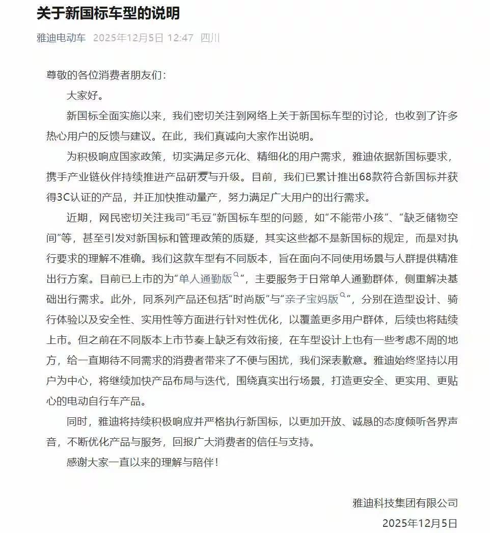 新国标电动车争议不断 雅迪致歉竟因车型理解偏差? 12月5日中午,雅迪科技集团发布致歉声明。这家2001年创立、2016年5月登陆港股的电动车巨头,就旗下毛豆新国标车型的设计与版本衔接问题,向消费者表达歉意。此事让12月1日新国标过渡期结束后的行业争议再引关注。 12月1日电动自行车新国标过渡期正式截止。新规落地后,网上立马冒出不少吐槽。有网友说新国标要求电动车时速超25公里就断电,鞍座得是金属的,不能装后视镜,连娃都不能带。这些说法让想换车的老百姓犯了难,甚至有人质疑新规的合理性。12月4日晚,中国自行车协会出来回应。协会表示网络热议是消费者关注新规产品的体现。个别企业对新标准准备不足,宣传也不到位,才造成网民误读。雅迪此次致歉的核心是毛豆单人通勤版的争议。此前网民集中吐槽这款车不能带娃,缺储物空间。部分人还把锅甩给新国标。雅迪在声明里澄清,这些槽点不是新国标规定。是企业对执行要求理解有偏差。毛豆车型有多个版本。已上市的单人通勤版只针对单人通勤群体。同系列时尚版和亲子宝妈版会后续上架。雅迪承认自身在版本节奏和车型设计上有问题。要知道雅迪已推出68款合规且有3C认证的产品。全国有100余家企业的600余款新国标车型通过认证。网传金属鞍座只是极个别案例。主流车型都有舒适发泡座椅。新国标还鼓励装后视镜。70%以上新车型能装儿童座椅。时速超25公里也只是停动力而非急刹。有网友觉得雅迪是没摸清用户需求才翻车。也有人认为是新规落地后企业适配没跟上。 新国标电动车争议多因信息误读。雅迪的致歉给行业和消费者提了醒,选车认准官方解读才靠谱。新国标电动车价格上涨你能接受吗 如何评价新国标电动车的安全性 雅迪问题电动车