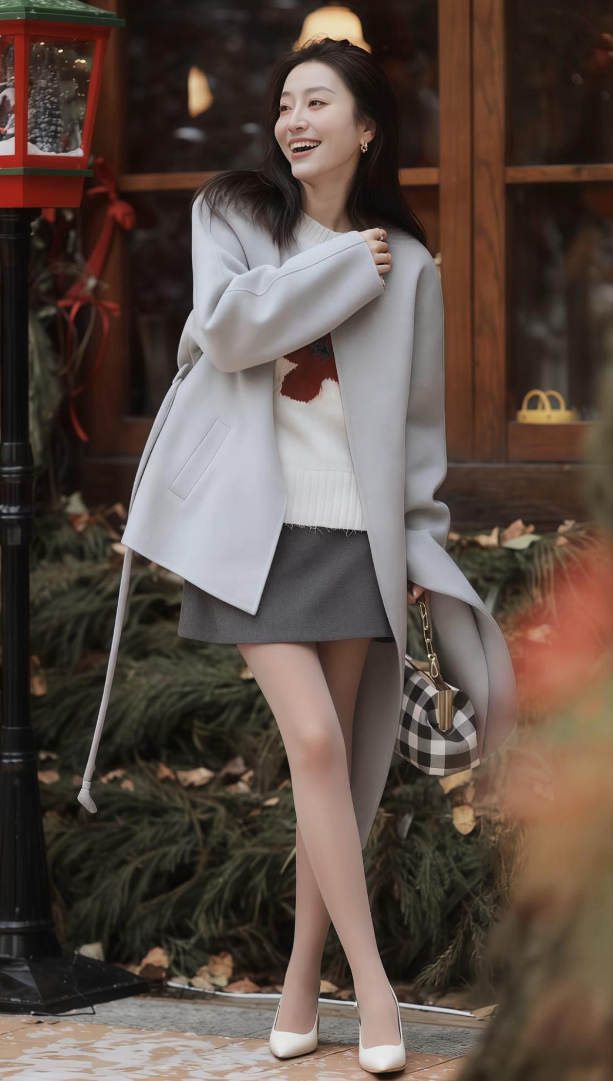 冬日暖阳下的时尚穿搭,灰色大衣搭配白色高跟鞋,优雅又温暖。