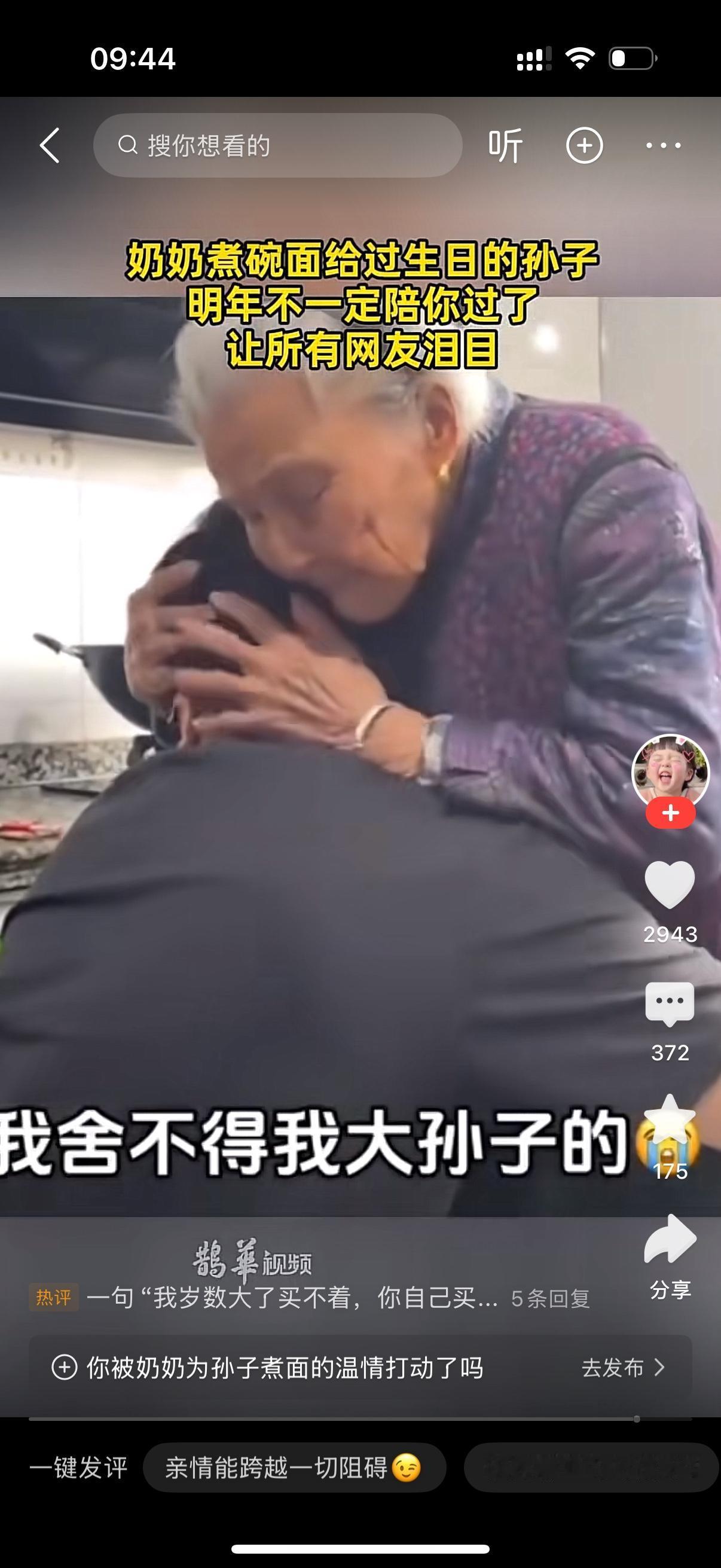孙子走进厨房,100岁的奶奶给他煮了一碗面,上面还加了两个荷包蛋。孙子说今天什么日子,这么丰盛啊?奶奶说今天是你生日啊。孙子感动坏了,啊呦,我奶奶还记得我生日,我自己都忘记了。奶奶从口袋里掏出钱递给孙子说,我老了买不着了,你自己出去买点好吃的。孙子感动坏了,依偎在奶奶的怀里,你给钱,干嘛?奶奶。奶奶说,明年我就不一定能陪到你。我也舍不得我大孙子的。孙子泪流满面。