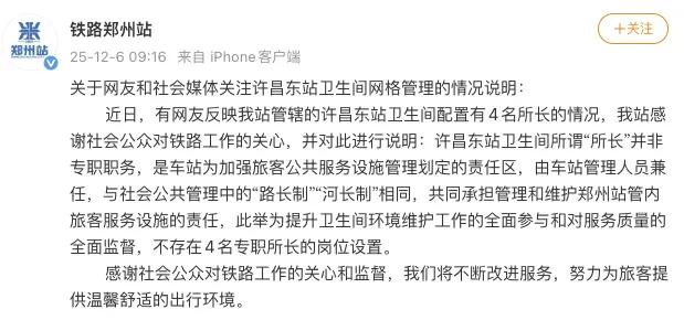 近日,有网友反映我站管辖的许昌东站卫生间配置有4名所长的情况,我站感谢社会公众对铁路工作的关心,并对此进行说明:许昌东站卫生间所谓“所长”并非专职职务,是车站为加强旅客公共服务设施管理划定的责任区,由车站管理人员兼任,与社会公共管理中的“路长制”“河长制”相同,共同承担管理和维护郑州站管内旅客服务设施的责任,此举为提升卫生间环境维护工作的全面参与和对服务质量的全面监督,不存在4名专职所长的岗位设置。