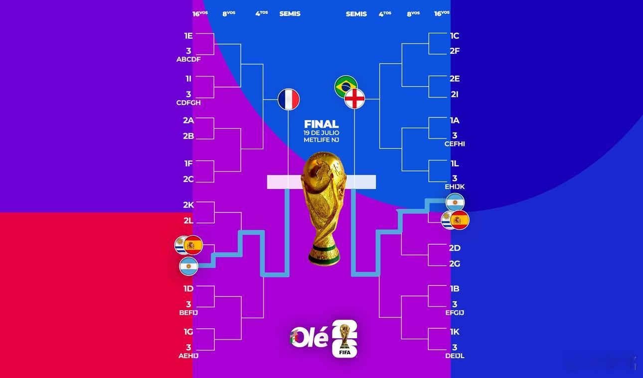 阿根廷队 如果阿根廷队获得J组第一,1/16决赛大概率是碰H组第二乌拉圭;1/8决赛对手相对较弱,巴拉圭/澳大利亚/埃及;1/4决赛大概率遇到K组第一杀出来的葡萄牙,哈哈,FIFA就是这样设计的梅罗对决;半决赛将遇到英格兰和巴西的胜者;决赛对阵法国和西班牙其中的一个。一旦阿根廷不小心落到J组第二,那么晋级之路就是按照附图(奥莱报制图)左半边这么走了。1/16决赛大概率是碰H组第一西班牙,那不直接就噶了吗?如果侥幸赢了,1/8决赛可能碰克罗地亚或哥伦比亚;1/4决赛大概率遇到比利时;半决赛将遇到德国、荷兰、法国其中的一个。小组第三的情况暂时不考虑。默认状态是,强队都希望以小组第一出线。但赛程出来后,有可能在基本确保出线的情况下,小组最后一场比赛的踢法是“选择对手”。做个极端假设,西班牙出冷门了,铁定H组第二了,那么阿根廷还要往死里拼J组第一吗?果真如此,那真的就是1/16决赛直接阿根廷碰西班牙了!很多强队不仅要考虑1/16决赛对手,还要考虑后面几轮淘汰赛的道路,可谓步步为营,一招走错,满盘皆输啊!当然,还是英格兰主帅图赫尔想的通透,啥签儿不签儿的,你要是目标夺冠,你得把他们都给办了!先遇上谁,晚遇上谁,有那么重要吗? 世界杯抽签