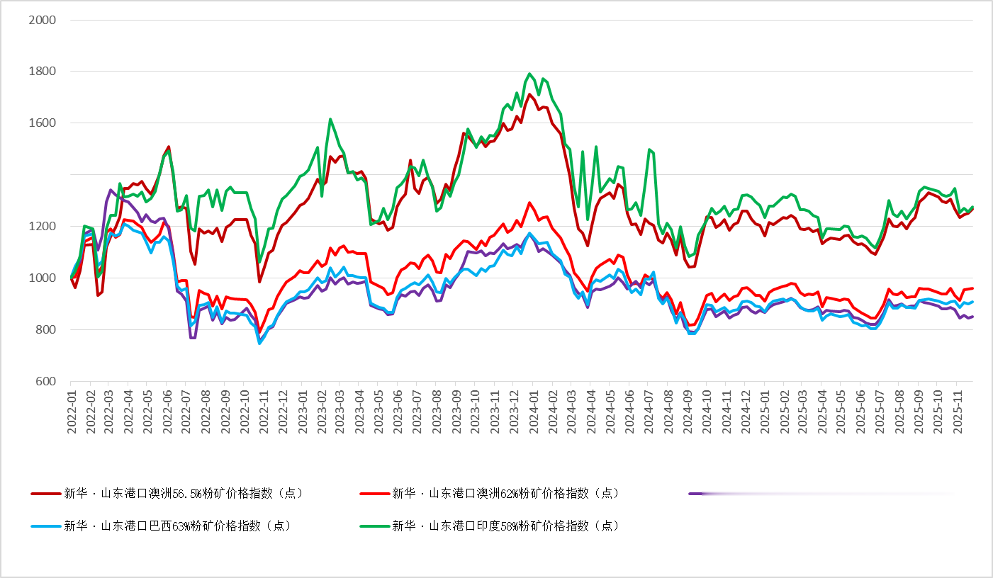 新华财经北京12月5日电(郑豪)据新华指数研究院监测,截至12月2日,新华·山东港口62%澳大利亚粉矿价格指数报960.90点,较11月25日上涨4.77点,涨幅0.50%;新华·山东港口63%澳大利亚块矿价格指数报851.02点,较11月25日上涨5.61点,涨幅0.66%;其它铁矿石指数及价格变动情况详见表格。