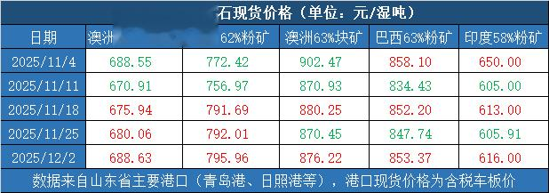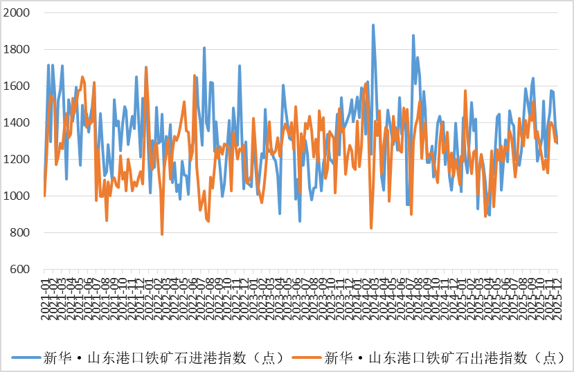 截至12月2日,新华·山东港口铁矿石进港指数报1289.18点,较11月25日下跌92.29点,跌幅6.68%;新华·山东港口铁矿石出港指数报1324.85点,较11月25日上涨30.04点,涨幅2.32%。