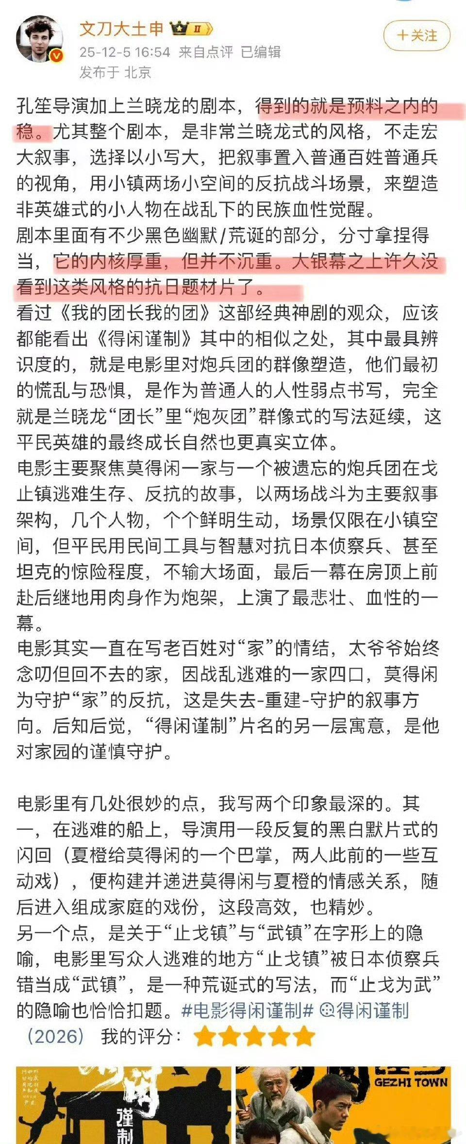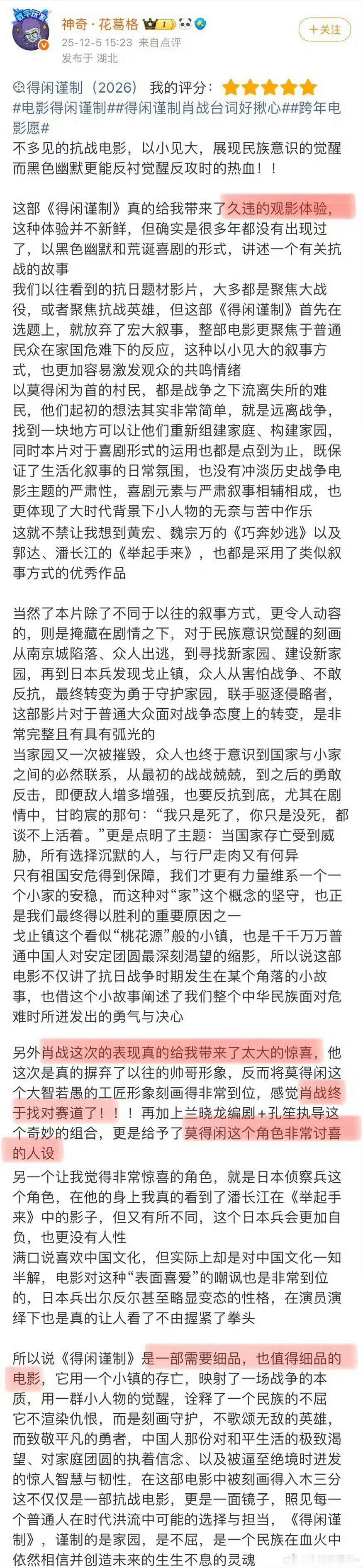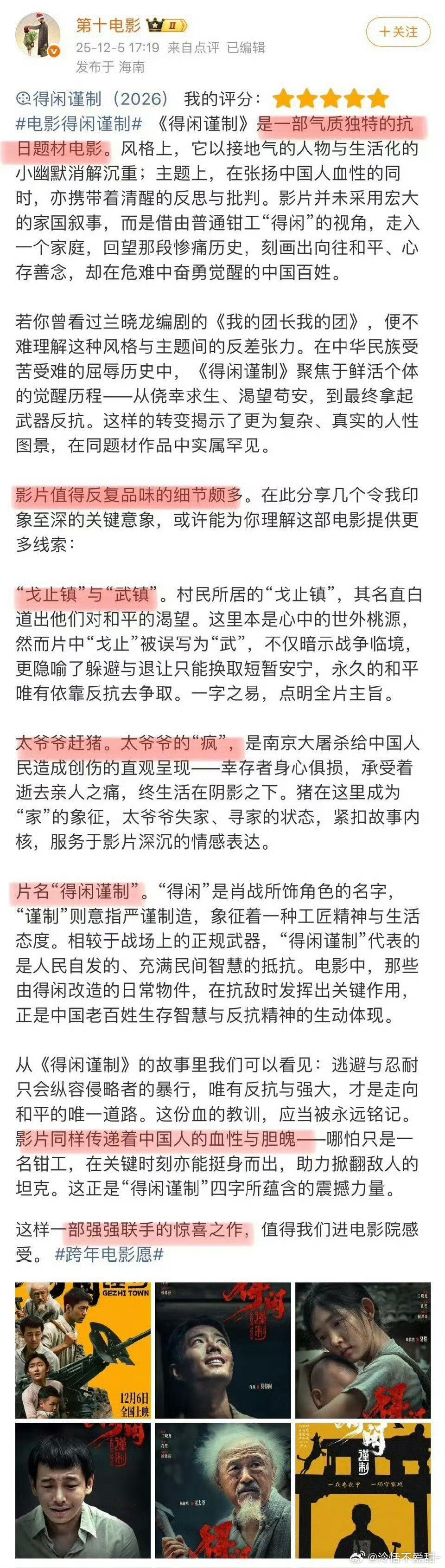 刷到大家看完《得闲谨制》的观后感 是一部气质独特的抗日电影 影片细节很多 黑色幽默 演员演技在线肖战一年5亿预售得闲谨制排片