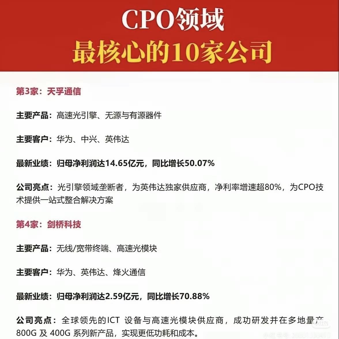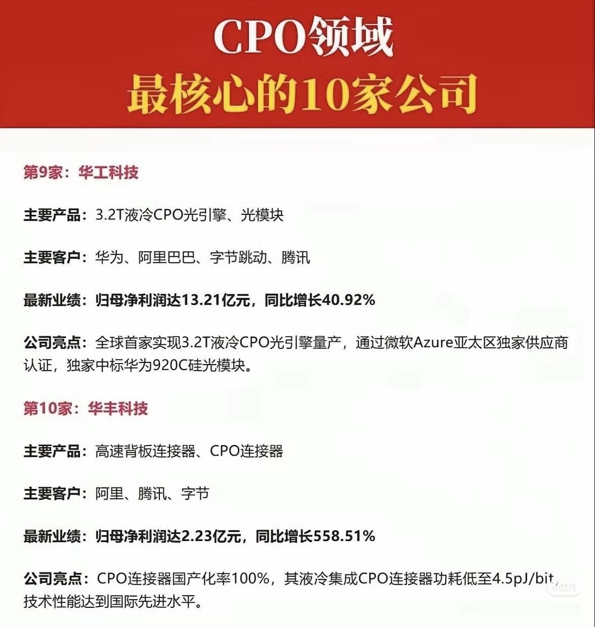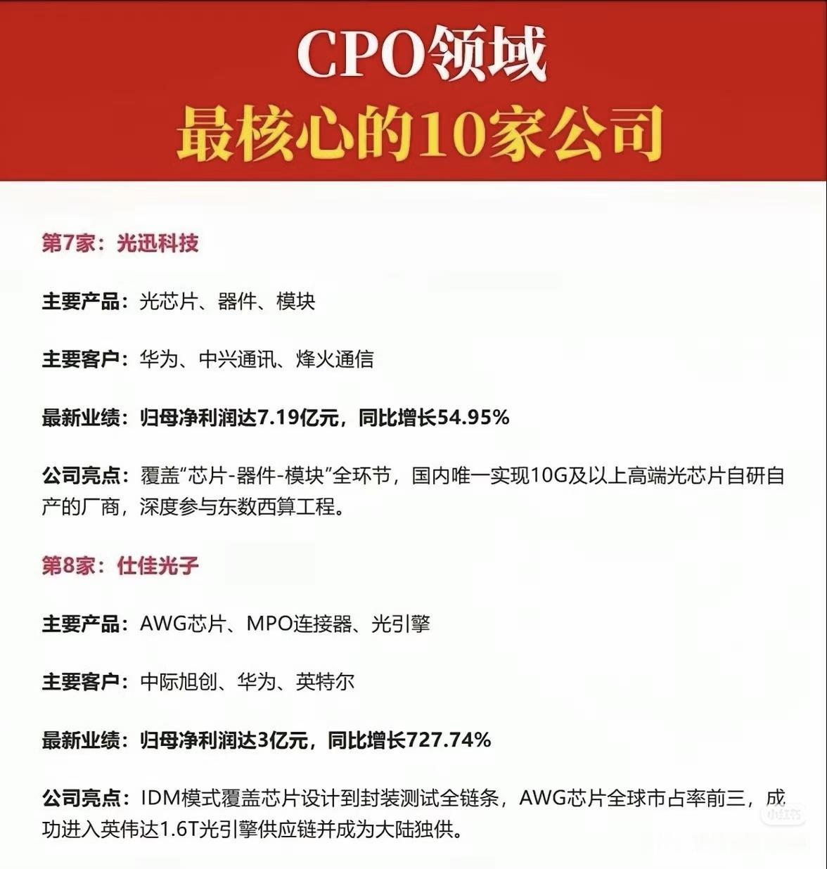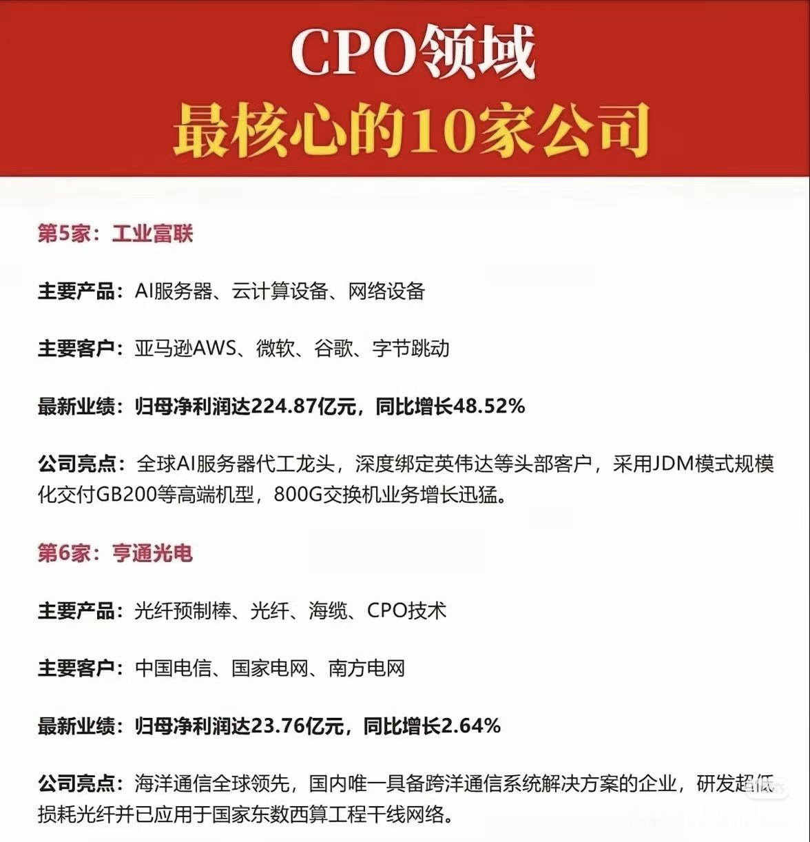 CPO领域最核心的10家公司情况: 第1家新易盛,主要产品有800G/1.6T LPO光模块、硅光模块,客户涵盖亚马逊、微软、英伟达等,归母净利润63.27亿元,同比增长284.38%,亮点是800G LPO光模块获Meta大模型训练集群独家订单,1.6T产品通过亚马逊认证,硅光方案良率突破95%。第2家中际旭创,产品含800G/1.6T光模块、CPO产品,客户有英伟达、谷歌、微软、亚马逊AWS、阿里巴巴等,归母净利润71.32亿元,同比增长90.05%,是全球光模块龙头,800G产品占全球40%以上份额,深度绑定英伟达、亚马逊等头部客户,还与英伟达联合开发3.2T CPO原型机。 第3家天孚通信,主要产品为高速光引擎、无源与有源器件,客户包括华为、中兴、英伟达等,归母净利润14.65亿元,同比增长50.07%,是光引擎领域垄断者,为英伟达独家供应商,净利率增速超80%,能为CPO技术提供一站式整合解决方案。第4家剑桥科技,产品有无线/宽带终端、高速光模块,客户含华为、英伟达、烽火通信等,归母净利润2.59亿元,同比增长70.88%,是全球领先的ICT设备与高速光模块供应商,成功研发并在多地量产800G及400G系列产品,实现更低功耗和成本。 第5家工业富联,主要产品为AI服务器、云计算设备、网络设备,客户有亚马逊AWS、微软、谷歌、字节跳动等,归母净利润224.87亿元,同比增长48.52%,是全球AI服务器代工龙头,深度绑定英伟达等头部客户,采用JDM模式规模化交付GB200等高端机型,800G交换机业务增长迅猛。第6家亨通光电,产品包括光纤预制棒、光纤、海缆、CPO技术,客户有中国电信、国家电网、南方电网等,归母净利润23.76亿元,同比增长2.64%,海洋通信全球领先,是国内唯一具备跨洋通信系统解决方案的企业,研发超低损耗光纤并已应用于国家东数西算工程干线网络。 第7家光迅科技,主要产品有光芯片、器件、模块,客户包括华为、中兴通讯、烽火通信等,归母净利润7.19亿元,同比增长54.95%,覆盖“芯片-器件-模块”全环节,是国内唯一实现10G及以上高端光芯片自研自产的厂商,深度参与东数西算工程。第8家仕佳光子,产品为AWG芯片、MPO连接器、光引擎,客户有中际旭创、华为、英特尔等,归母净利润3亿元,同比增长727.74%,采用IDM模式覆盖芯片设计到封装测试全链条,AWG芯片全球市占率前三,成功进入英伟达1.6T光引擎供应链并成为大陆独供。 第9家华工科技,主要产品有3.2T液冷CPO光引擎、光模块,客户涵盖华为、阿里巴巴、字节跳动、腾讯等,归母净利润13.21亿元,同比增长40.92%,是全球首家实现3.2T液冷CPO光引擎量产的企业,通过微软Azure亚太区独家供应商认证,独家中标华为920C硅光模块。第10家华丰科技,主要产品为高速背板连接器、CPO连接器,客户有阿里、腾讯、字节等,归母净利润2.23亿元,同比增长558.51%,CPO连接器国产化率100%,其液冷集成CPO连接器功耗低至4.5pJ/bit,技术性能达到国际先进水平。
