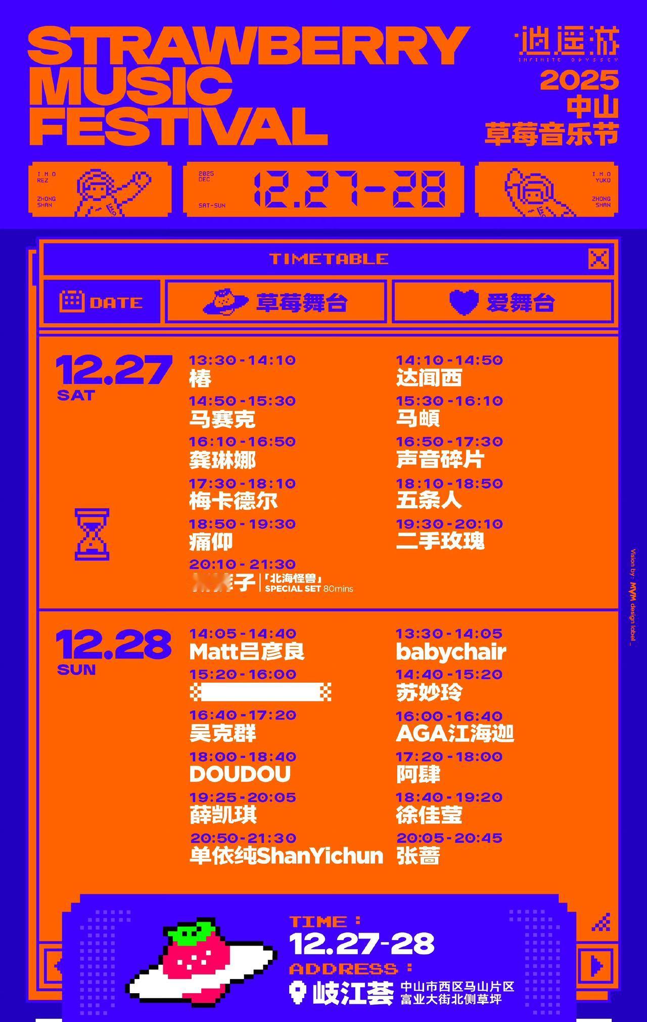 别眨眼!单依纯、薛凯琪领衔,草莓音乐节年终狂欢压轴中山! 这是2025草莓音乐节的年度收官之战,12月27-28日,首次登陆中山岐江荟。两大舞台,超23组音乐人,用两天音浪点燃你的冬天。 阵容王炸,双倍快乐! · 27日(周六)· 乐队狂欢日:摇滚迷的终极梦想!新裤子将压轴带来80分钟超长专属“北海怪兽”现场。痛仰、二手玫瑰、五条人、龚琳娜等顶级乐队与音乐人全员集结,能量爆表。 ·28日(周日)· 唱作人闪耀日:流行与创作的天堂!新生代实力唱将单依纯将首次登上草莓音乐节舞台。薛凯琪、徐佳莹、吴克群、张蔷等唱作俱佳的明星轮番登场。更有一位神秘唱作演俱佳的音乐人作为彩蛋,等待揭晓。 年底最后一场音乐狂欢,别再错过!快约上好友,来中山共赴这场星光与音浪交织的派对。