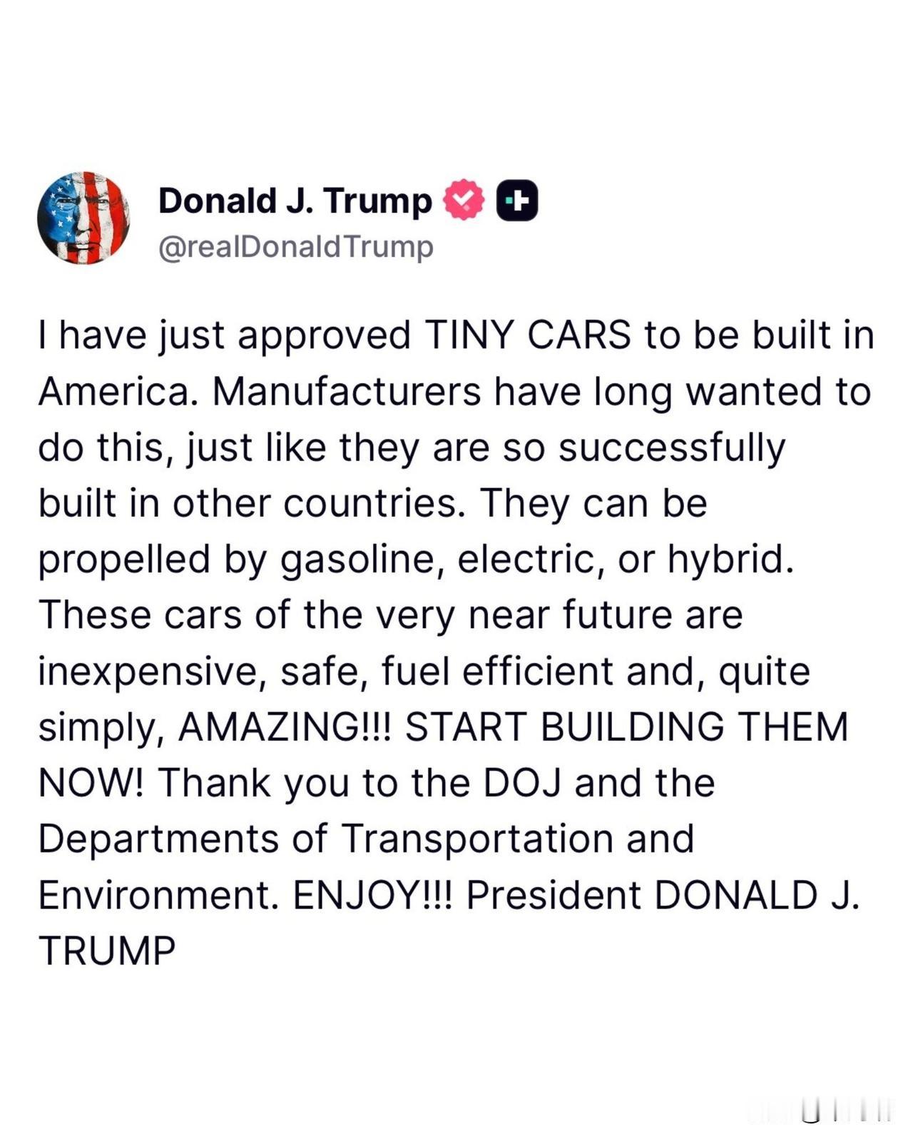 突发新闻:特朗普总统刚刚批准在美国生产微型汽车,此举意义重大。 “就像它们在其他国家成功制造的那样。它们可以由汽油、电力或混合动力驱动。” “这些即将面世的汽车价格低廉、安全可靠、节能省油,简直太棒了!!!现在就开始生产吧!感谢司法部、交通部和环境部。尽情享受吧!!!”