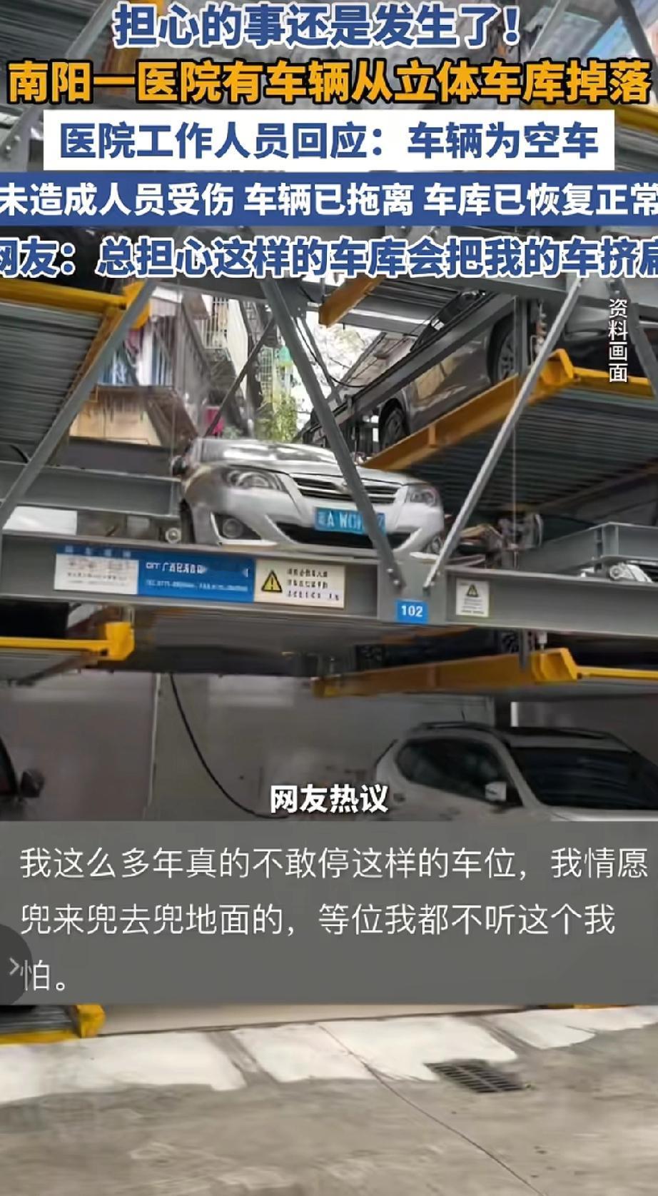 2025年12月5日,南阳一医院的立体车库有车辆掉落,疑似因刹车问题导致。不少网友表达了对立体车库安全性的担忧,有网友称曾在类似车库遭遇车辆被砸的情况,还有网友担心车辆会被立体车库挤扁。事后医院工作人员表示,事故车辆为空车,未造成人员受伤,车辆已拖离,车库已恢复正常使用。(来源于@海报新闻)